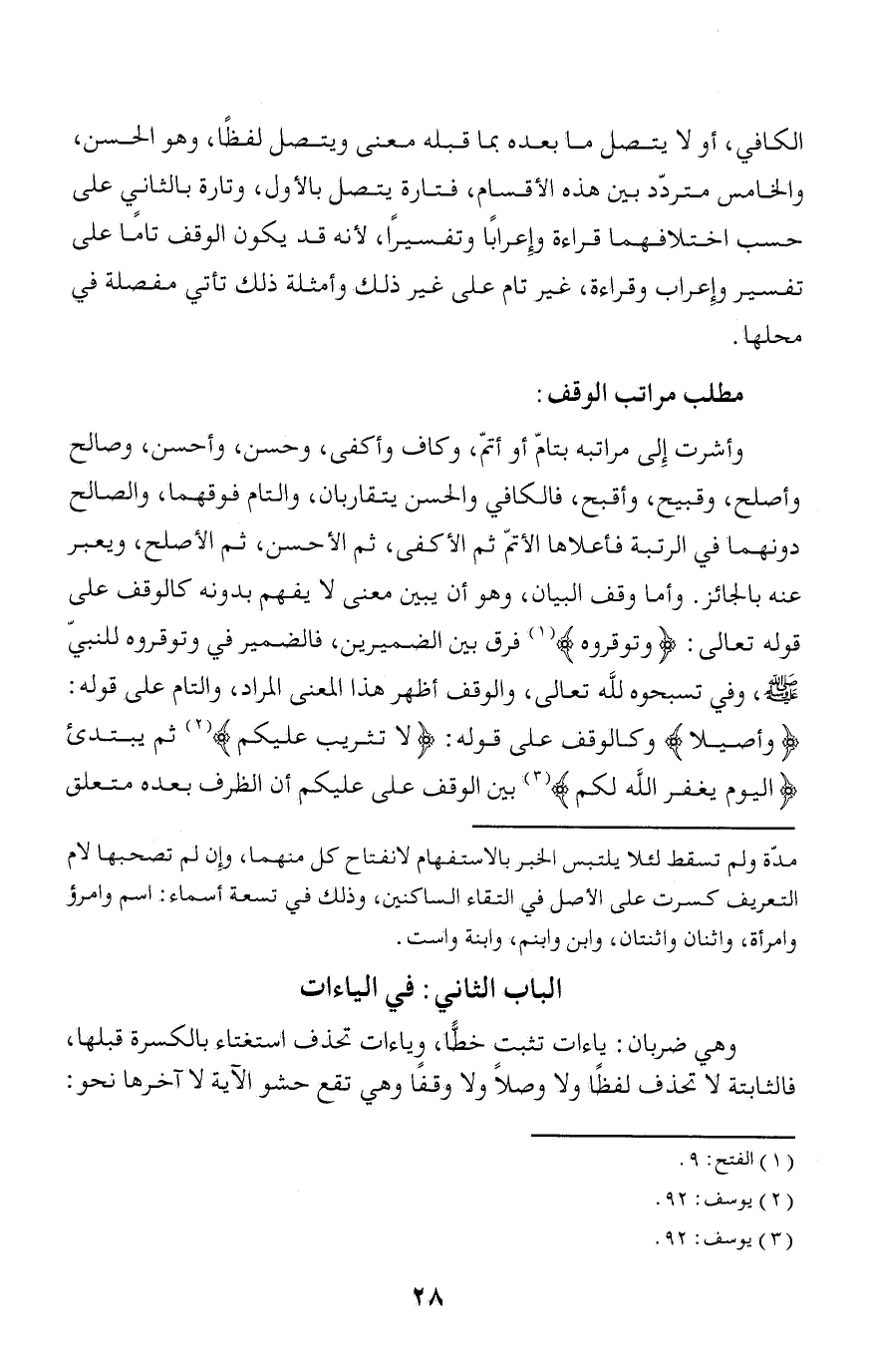 وأشرت إلى مراتبه بتامّ أو أتمّ، وكاف وأكفى، وحسن، وأحسن، وصالح وأصلح، وقبيح، وأقبح، فالكافي والحسن يتقاربان، والتام فوقهما، والصالح دونهما في الرتبة فأعلاها الأتمّ ثم الأكفى، ثم الأحسن، ثم الأصلح، ويعبر عنه بالجائز. وأما وقف البيان، وهو أن يبين معنى لا يفهم بدونه كالوقف على قوله تعالى: وَتُوَقِّرُوهُ (¬1) فرق بين الضميرين، فالضمير في وتوقروه للنبيّ صلّى الله عليه وسلّم، وفي تسبحوه لله تعالى، والوقف أظهر هذا المعنى المراد، والتام على قوله: