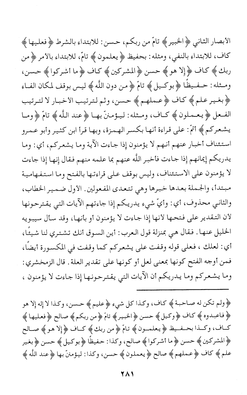 كاف ما أَشْرَكُوا حسن، ومثله: حفيظا بِوَكِيلٍ تامّ مِنْ دُونِ اللَّهِ ليس بوقف لمكان الفاء بِغَيْرِ عِلْمٍ كاف عَمَلَهُمْ حسن، وثم لترتيب الأخبار لا لترتيب الفعل يَعْمَلُونَ كاف، ومثله: لَيُؤْمِنُنَّ بِها عِنْدَ اللَّهِ تامّ وَما يُشْعِرُكُمْ أتمّ: على قراءة أنها بكسر الهمزة، وبها قرأ ابن كثير وأبو عمرو استئناف أخبار عنهم أنهم لا يؤمنون إذا جاءت الآية وما يشعركم، أي: وما يدريكم إيمانهم إذا جاءت فأخبر الله عنهم بما علمه منهم فقال إنها إذا جاءت لا يؤمنون على الاستئناف، وليس بوقف على قراءتها بالفتح وما استفهامية مبتدأ، والجملة بعدها خبرها وهي تتعدى المفعولين. الأول ضمير الخطاب، والثاني محذوف، أي: وأيّ شيء يدريكم إذا جاءتهم الآيات التي يقترحونها لأن التقدير على فتحها لأنها إذا جاءت لا يؤمنون أو بأنها، وقد سأل سيبويه الخليل عنها. فقال هي بمنزلة قول العرب: أين السوق أنك تشتري لنا شيئا، أي: لعلك، فعلى قوله وقفت على يشعركم كما وقفت في المكسورة أيضا، فمن أوجه الفتح كونها بمعنى لعل أو كونها على تقدير العلة. قال الزمخشري: