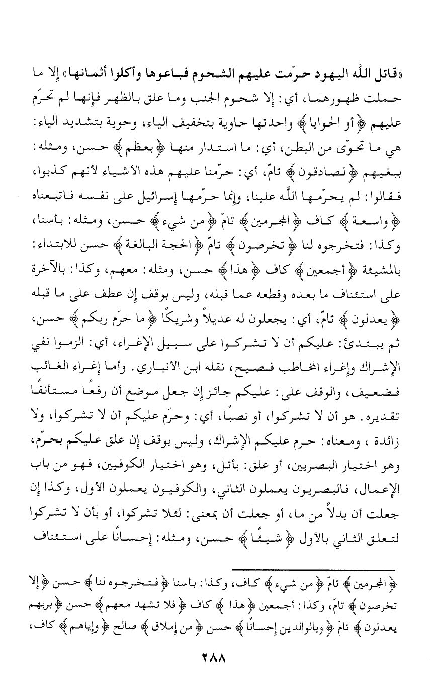 بالمشيئة أَجْمَعِينَ كاف هذا حسن، ومثله: معهم، وكذا: بالآخرة على استئناف ما بعده وقطعه عما قبله، وليس بوقف إن عطف على ما قبله يَعْدِلُونَ تامّ، أي: يجعلون له عديلا وشريكا ما حَرَّمَ رَبُّكُمْ حسن، ثم يبتدئ: عليكم أن لا تشركوا على سبيل الإغراء، أي: الزموا نفي الإشراك وإغراء المخاطب فصيح، نقله ابن الأنباري. وأما إغراء الغائب فضعيف، والوقف على: عليكم جائز إن جعل موضع أن رفعا مستأنفا تقديره. هو أن لا تشركوا، أو نصبا، أي: وحرّم عليكم أن لا تشركوا، ولا زائدة، ومعناه: حرم عليكم الإشراك، وليس بوقف إن علق عليكم بحرّم، وهو اختيار البصريين، أو علق: باتل، وهو اختيار الكوفيين، فهو من باب الإعمال، فالبصريون يعملون الثاني، والكوفيون يعملون الأول، وكذا إن جعلت أن بدلا من ما، أو جعلت أن بمعنى: لئلا تشركوا، أو بأن لا تشركوا لتعلق الثاني بالأول شَيْئاً حسن، ومثله: إحسانا على استئناف