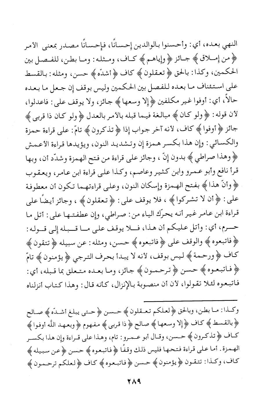 النهي بعده، أي: وأحسنوا بالوالدين إحسانا، فإحسانا مصدر بمعنى الأمر مِنْ إِمْلاقٍ جائز وَإِيَّاهُمْ كاف، ومثله: وما بطن، للفصل بين الحكمين، وكذا: بالحق تَعْقِلُونَ كاف أَشُدَّهُ حسن، ومثله: بالقسط على استئناف ما بعده للفصل بين الحكمين وليس بوقف إن جعل ما بعده حالا، أي: أوفوا غير مكلفين إِلَّا وُسْعَها جائز، ولا يوقف على: فاعدلوا، لأن قوله: وَلَوْ كانَ مبالغة فيما قبله بالأمر بالعدل وَلَوْ كانَ ذا قُرْبى جائز أَوْفُوا كاف، لأنه آخر جواب إذا تَذَكَّرُونَ تامّ: على قراءة حمزة والكسائي: وإن هذا بكسر همزة إن وتشديد النون، ويؤيدها قراءة الأعمش وهذا صِراطِي بدون إنّ، وجائز على قراءة من فتح الهمزة وشدّد أن، وبها قرأ نافع وأبو عمرو وابن كثير وعاصم، وكذا على قراءة ابن عامر، ويعقوب وَأَنَّ هذا بفتح الهمزة وإسكان النون، وعلى قراءتهما تكون أن معطوفة على: أَلَّا تُشْرِكُوا، فلا يوقف على: تَعْقِلُونَ، وجائز أيضا على قراءة ابن عامر غير أنه يحرّك الياء من: صراطي، وإن عطفتها على: أتل ما حرم، أي: وأتل عليكم أن هذا، فلا يوقف على ما قبله إلى قوله: