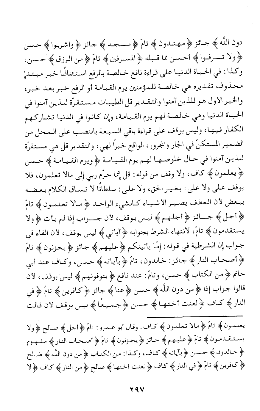 دُونِ اللَّهِ جائز مُهْتَدُونَ تامّ مَسْجِدٍ جائز وَاشْرَبُوا حسن وَلا تُسْرِفُوا أحسن مما قبله الْمُسْرِفِينَ تامّ مِنَ الرِّزْقِ حسن، وكذا: في الحياة الدنيا على قراءة نافع خالصة بالرفع استئنافا خبر مبتدإ محذوف تقديره هي خالصة للمؤمنين يوم القيامة أو الرفع خبر بعد خبر، والخبر الأول هو للذين آمنوا والتقدير قل الطيبات مستقرّة للذين آمنوا في الحياة الدنيا وهي خالصة لهم يوم القيامة، وإن كانوا في الدنيا تشاركهم الكفار فيها، وليس بوقف على قراءة باقي السبعة بالنصب على المحل من الضمير المستكنّ في الجار والمجرور، الواقع خبرا لهي، والتقدير قل هي مستقرّة للذين آمنوا في حال خلوصها لهم يوم القيامة ويَوْمَ الْقِيامَةِ حسن يَعْلَمُونَ كاف، ولا وقف من قوله: قل إنما حرّم ربي إلى ما لا تعلمون، فلا يوقف على ولا على: بغير الحق، ولا على: سلطانا لا تساق الكلام بعضه ببعض لأن العطف يصير الأشياء كالشيء الواحد ما لا تَعْلَمُونَ تامّ أَجَلٌ جائز أَجَلُهُمْ ليس بوقف، لأن جواب إذا لم يأت وَلا يَسْتَقْدِمُونَ تامّ، لانتهاء الشرط بجوابه آياتِي ليس بوقف، لأن الفاء في جواب إن الشرطية في قوله: إمّا يأتينكم عَلَيْهِمْ جائز يَحْزَنُونَ تامّ أَصْحابُ النَّارِ جائز: خالِدُونَ، تامّ بِآياتِهِ حسن، وكاف عند أبي حاتم مِنَ الْكِتابِ حسن، وتامّ: عند نافع يَتَوَفَّوْنَهُمْ ليس بوقف، لأن قالوا جواب إذا مِنْ دُونِ اللَّهِ حسن عَنَّا جائز كافِرِينَ تامّ فِي النَّارِ كاف لَعَنَتْ أُخْتَها حسن جَمِيعاً ليس بوقف لأن قالت