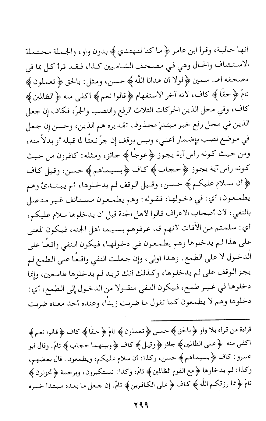 كونه رأس آية يجوز عِوَجاً جائز، ومثله: كافِرُونَ من حيث كونه رأس آية يجوز حِجابٌ كاف بِسِيماهُمْ حسن، وقيل كاف أَنْ سَلامٌ عَلَيْكُمْ حسن، وقيل الوقف لم يدخلوها، ثم يبتدئ وهم يطمعون، أي: في دخولها، فقوله: وهم يطمعون مستأنف غير متصل بالنفي، لأن أصحاب الأعراف قالوا لأهل الجنة قبل أن يدخلوها سلام عليكم، أي: سلمتم من الآفات لأنهم قد عرفوهم بسيما أهل الجنة، فيكون المعنى على هذا لم يدخلوها وهم يطمعون في دخولها، فيكون النفي واقعا على الدخول لا على الطمع. وهذا أولى، وإن جعلت النفي واقعا على الطمع لم يجز الوقف على لم يدخلوها، وكذلك أنك تريد لم يدخلوها طامعين، وإنما دخلوها في غير طمع، فيكون النفي منقولا من الدخول إلى الطمع، أي: