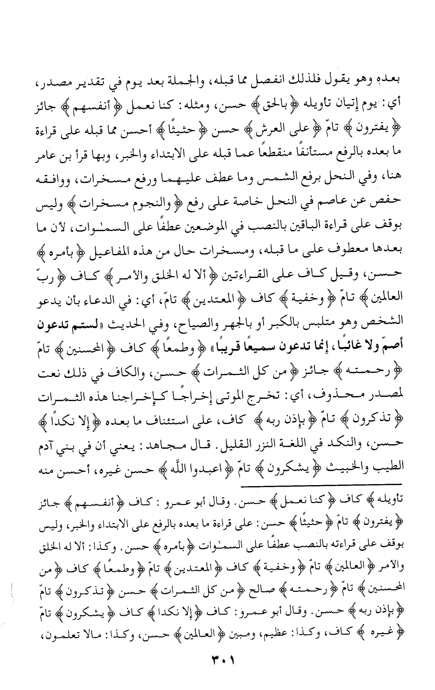بعده وهو يقول فلذلك انفصل مما قبله، والجملة بعد يوم في تقدير مصدر، أي: يوم إتيان تأويله بِالْحَقِّ حسن، ومثله: كنا نعمل أَنْفُسَهُمْ جائز يَفْتَرُونَ تامّ عَلَى الْعَرْشِ حسن حَثِيثاً أحسن مما قبله على قراءة ما بعده بالرفع مستأنفا منقطعا عما قبله على الابتداء والخبر، وبها قرأ ابن عامر هنا، وفي النحل برفع الشمس وما عطف عليهما ورفع مسخرات، ووافقه حفص عن عاصم في النحل خاصة على رفع وَالنُّجُومَ مُسَخَّراتٍ وليس بوقف على قراءة الباقين بالنصب في الموضعين عطفا على السموات، لأن ما بعدها معطوف على ما قبله، ومسخرات حال من هذه المفاعيل بِأَمْرِهِ حسن، وقيل كاف على القراءتين أَلا لَهُ الْخَلْقُ وَالْأَمْرُ كاف رَبُّ الْعالَمِينَ تامّ وَخُفْيَةً كاف الْمُعْتَدِينَ تامّ، أي: في الدعاء بأن يدعو الشخص وهو متلبس بالكبر أو بالجهر والصياح، وفي الحديث «لستم تدعون أصمّ ولا غائبا، إنما تدعون سميعا قريبا» وَطَمَعاً كاف الْمُحْسِنِينَ تامّ رَحْمَتِهِ جائز مِنْ كُلِّ الثَّمَراتِ حسن، والكاف في ذلك نعت لمصدر محذوف، أي: تخرج الموتى إخراجا كإخراجنا هذه الثمرات تَذَكَّرُونَ تامّ بِإِذْنِ رَبِّهِ كاف، على استئناف ما بعده إِلَّا نَكِداً حسن، والنكد في اللغة النزر القليل. قال مجاهد: يعني أن في بني آدم الطيب والخبيث يَشْكُرُونَ تامّ اعْبُدُوا اللَّهَ حسن غيره، أحسن منه