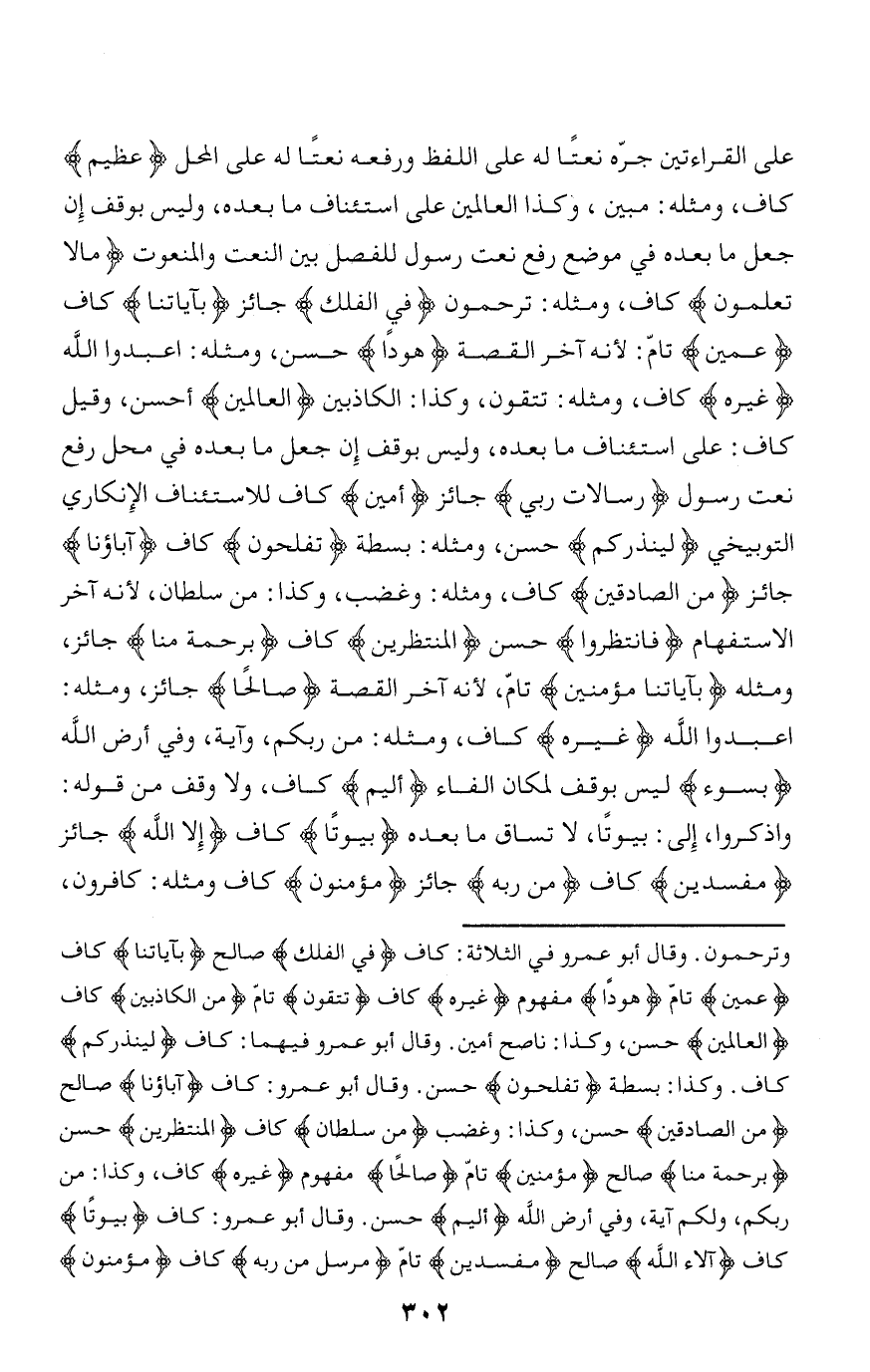 وترحمون. وقال أبو عمرو في الثلاثة: كاف فِي الْفُلْكِ صالح بِآياتِنا كاف عَمِينَ تامّ هُوداً مفهوم غَيْرُهُ كاف تَتَّقُونَ تامّ مِنَ الْكاذِبِينَ كاف الْعالَمِينَ حسن، وكذا: ناصح أمين. وقال أبو عمرو فيهما: كاف لِيُنْذِرَكُمْ كاف. وكذا: بسطة تُفْلِحُونَ حسن. وقال أبو عمرو: كاف آباؤُنا صالح مِنَ الصَّادِقِينَ حسن، وكذا: وغضب مِنْ سُلْطانٍ كاف الْمُنْتَظِرِينَ حسن بِرَحْمَةٍ مِنَّا صالح مُؤْمِنِينَ تامّ صالِحاً مفهوم غَيْرُهُ كاف، وكذا: من ربكم، ولكم آية، وفي أرض الله أَلِيمٌ حسن. وقال أبو عمرو: كاف بُيُوتاً كاف آلاءَ اللَّهِ صالح مُفْسِدِينَ تامّ مُرْسَلٌ مِنْ رَبِّهِ كاف مُؤْمِنُونَ