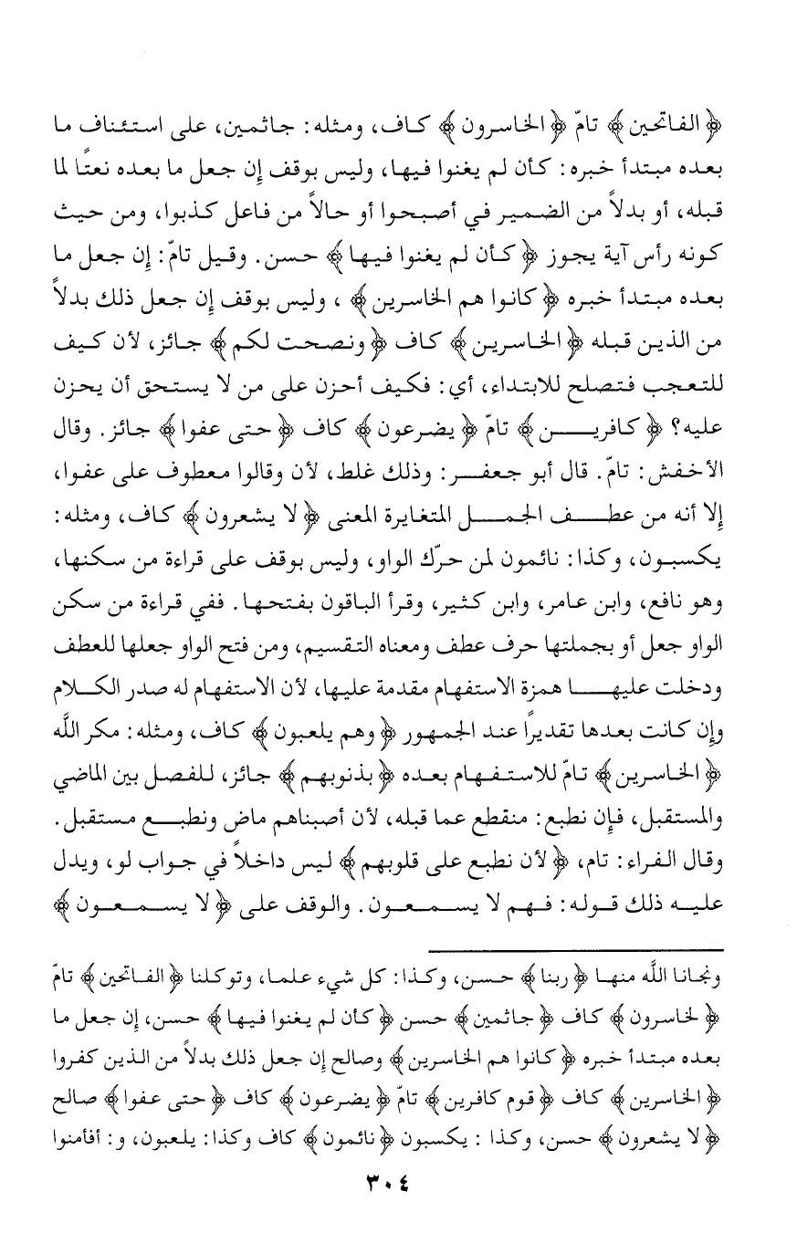 الْفاتِحِينَ تامّ لَخاسِرُونَ كاف، ومثله: جاثمين، على استئناف ما بعده مبتدأ خبره: كأن لم يغنوا فيها، وليس بوقف إن جعل ما بعده نعتا لما قبله، أو بدلا من الضمير في أصبحوا أو حالا من فاعل كذبوا، ومن حيث كونه رأس آية يجوز كَأَنْ لَمْ يَغْنَوْا فِيهَا حسن. وقيل تامّ: إن جعل ما بعده مبتدأ خبره كانُوا هُمُ الْخاسِرِينَ، وليس بوقف إن جعل ذلك بدلا من الذين قبله الْخاسِرِينَ كاف وَنَصَحْتُ لَكُمْ جائز، لأن كيف للتعجب فتصلح للابتداء، أي: فكيف أحزن على من لا يستحق أن يحزن عليه؟ كافِرِينَ تامّ يَضَّرَّعُونَ كاف حَتَّى عَفَوْا جائز. وقال الأخفش: تامّ. قال أبو جعفر: وذلك غلط، لأن وقالوا معطوف على عفوا، إلا أنه من عطف الجمل المتغايرة المعنى لا يَشْعُرُونَ كاف، ومثله: