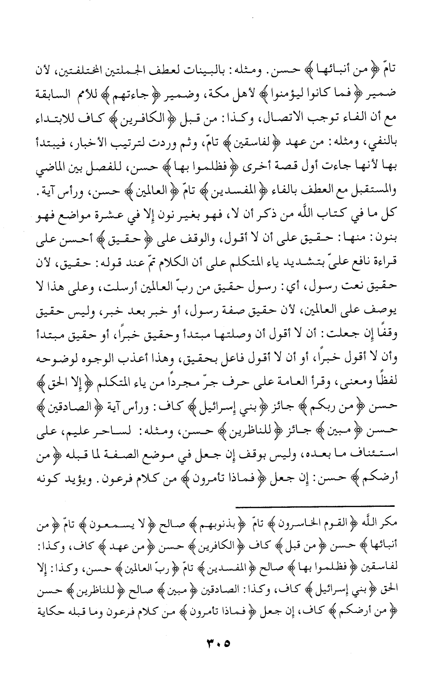 كل ما في كتاب الله من ذكر أن لا، فهو بغير نون إلا في عشرة مواضع فهو بنون: منها: حقيق على أن لا أقول، والوقف على حَقِيقٌ أحسن على قراءة نافع علىّ بتشديد ياء المتكلم على أن الكلام تمّ عند قوله: حقيق، لأن حقيق نعت رسول، أي: رسول حقيق من ربّ العالمين أرسلت، وعلى هذا لا يوصف على العالمين، لأن حقيق صفة رسول، أو خبر بعد خبر، وليس حقيق وقفا إن جعلت: أن لا أقول أن وصلتها مبتدأ وحقيق خبرا، أو حقيق مبتدأ وأن لا أقول خبرا، أو أن لا أقول فاعل بحقيق، وهذا أعذب الوجوه لوضوحه لفظا ومعنى، وقرأ العامة على حرف جرّ مجردا من ياء المتكلم إِلَّا الْحَقَّ حسن مِنْ رَبِّكُمْ جائز بَنِي إِسْرائِيلَ كاف: ورأس آية الصَّادِقِينَ حسن مُبِينٌ جائز لِلنَّاظِرِينَ حسن، ومثله: لساحر عليم، على استئناف ما بعده، وليس بوقف إن جعل في موضع الصفة لما قبله مِنْ أَرْضِكُمْ حسن: إن جعل فَماذا تَأْمُرُونَ من كلام فرعون. ويؤيد كونه