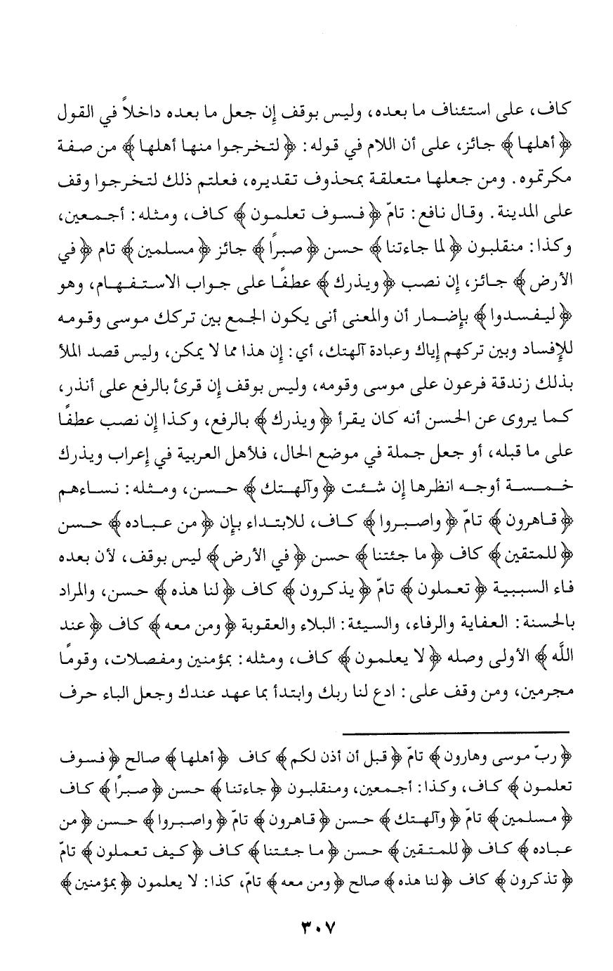 كاف، على استئناف ما بعده، وليس بوقف إن جعل ما بعده داخلا في القول أَهْلَها جائز، على أن اللام في قوله: لِتُخْرِجُوا مِنْها أَهْلَها من صفة مكرتموه. ومن جعلها متعلقة بمحذوف تقديره، فعلتم ذلك لتخرجوا وقف على المدينة. وقال نافع: تامّ فَسَوْفَ تَعْلَمُونَ كاف، ومثله: أجمعين، وكذا: منقلبون لَمَّا جاءَتْنا حسن صَبْراً جائز مُسْلِمِينَ تام فِي الْأَرْضِ جائز، إن نصب وَيَذَرَكَ عطفا على جواب الاستفهام، وهو لِيُفْسِدُوا بإضمار أن والمعنى أنى يكون الجمع بين تركك موسى وقومه للإفساد وبين تركهم إياك وعبادة آلهتك، أي: إن هذا مما لا يمكن، وليس قصد الملأ بذلك زندقة فرعون على موسى وقومه، وليس بوقف إن قرئ بالرفع على أنذر، كما يروى عن الحسن أنه كان يقرأ وَيَذَرَكَ بالرفع، وكذا إن نصب عطفا على ما قبله، أو جعل جملة في موضع الحال، فلأهل العربية في إعراب ويذرك خمسة أوجه انظرها إن شئت وَآلِهَتَكَ حسن، ومثله: نساءهم قاهِرُونَ تامّ وَاصْبِرُوا كاف، للابتداء بإن مِنْ عِبادِهِ حسن لِلْمُتَّقِينَ كاف ما جِئْتَنا حسن فِي الْأَرْضِ ليس بوقف، لأن بعده فاء السببية تَعْمَلُونَ تامّ يَذَّكَّرُونَ كاف لَنا هذِهِ حسن، والمراد بالحسنة: العفاية والرفاء، والسيئة: البلاء والعقوبة وَمَنْ مَعَهُ كاف عِنْدَ اللَّهِ الأولى وصله لا يَعْلَمُونَ كاف، ومثله: بمؤمنين ومفصلات، وقوما مجرمين، ومن وقف على: ادع لنا ربك وابتدأ بما عهد عندك وجعل الباء حرف