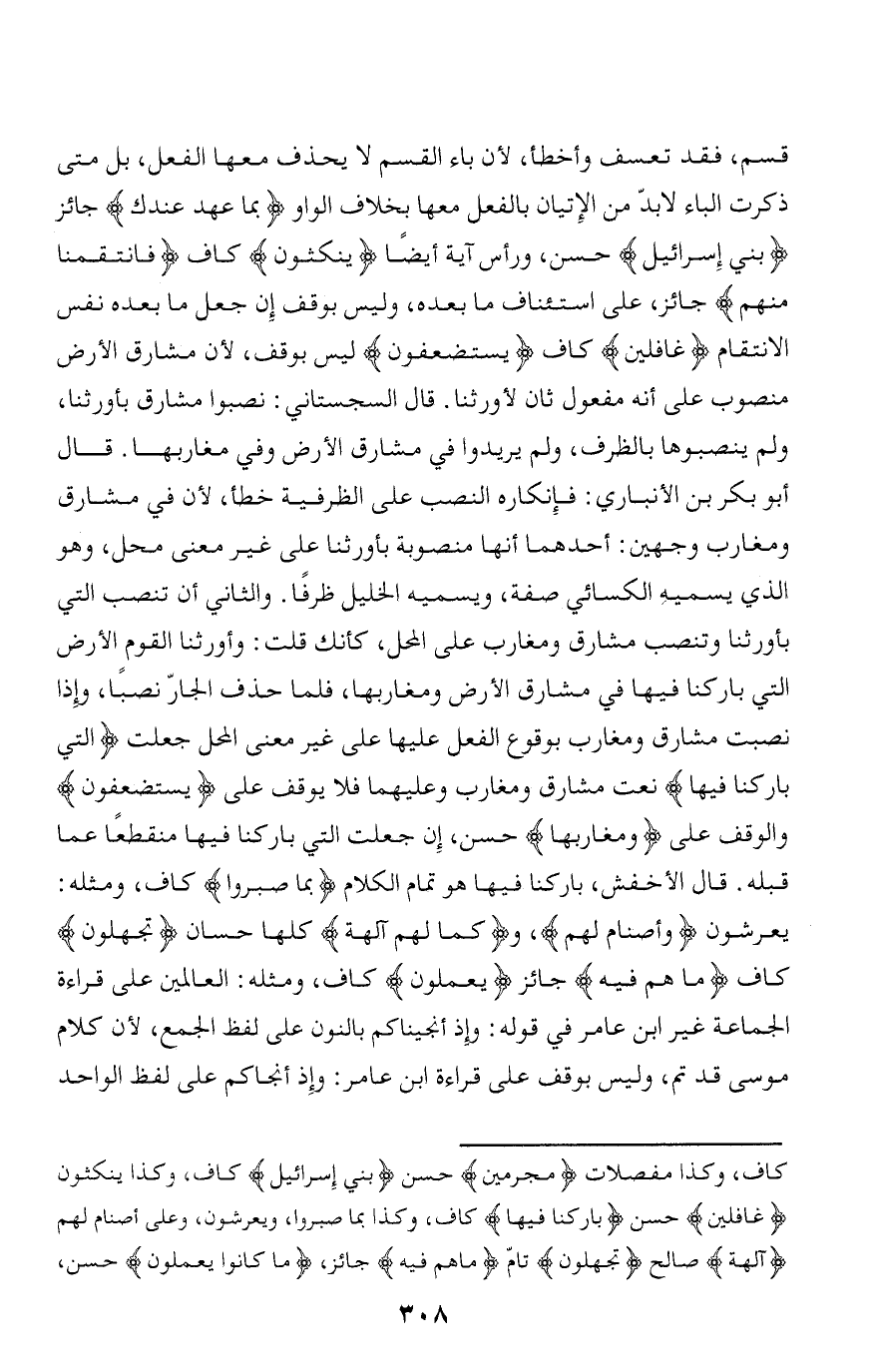 قسم، فقد تعسف وأخطأ، لأن باء القسم لا يحذف معها الفعل، بل متى ذكرت الباء لا بدّ من الإتيان بالفعل معها بخلاف الواو بِما عَهِدَ عِنْدَكَ جائز بَنِي إِسْرائِيلَ حسن، ورأس آية أيضا يَنْكُثُونَ كاف فَانْتَقَمْنا مِنْهُمْ جائز، على استئناف ما بعده، وليس بوقف إن جعل ما بعده نفس الانتقام غافِلِينَ كاف يُسْتَضْعَفُونَ ليس بوقف، لأن مشارق الأرض