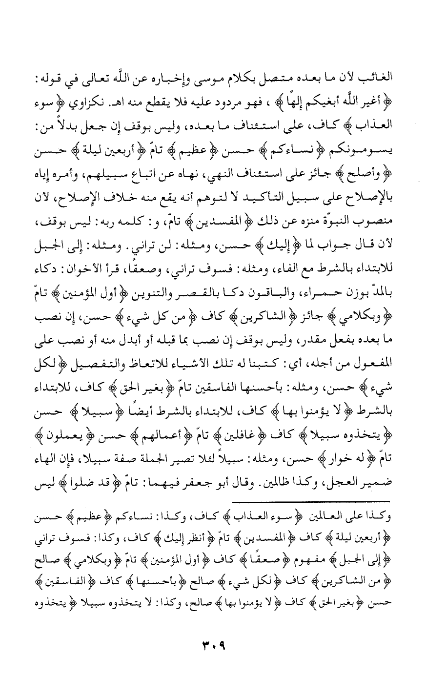 وكذا على العالمين سُوءَ الْعَذابِ كاف، وكذا: نساءكم عَظِيمٌ حسن أَرْبَعِينَ لَيْلَةً كاف الْمُفْسِدِينَ تامّ أَنْظُرْ إِلَيْكَ كاف، وكذا: فسوف تراني إِلَى الْجَبَلِ مفهوم صَعِقاً كاف أَوَّلُ الْمُؤْمِنِينَ تامّ وَبِكَلامِي صالح مِنَ الشَّاكِرِينَ كاف لِكُلِّ شَيْءٍ صالح بِأَحْسَنِها كاف الْفاسِقِينَ حسن بِغَيْرِ الْحَقِّ كاف لا يُؤْمِنُوا بِها صالح، وكذا: لا يتخذوه سبيلا يَتَّخِذُوهُ