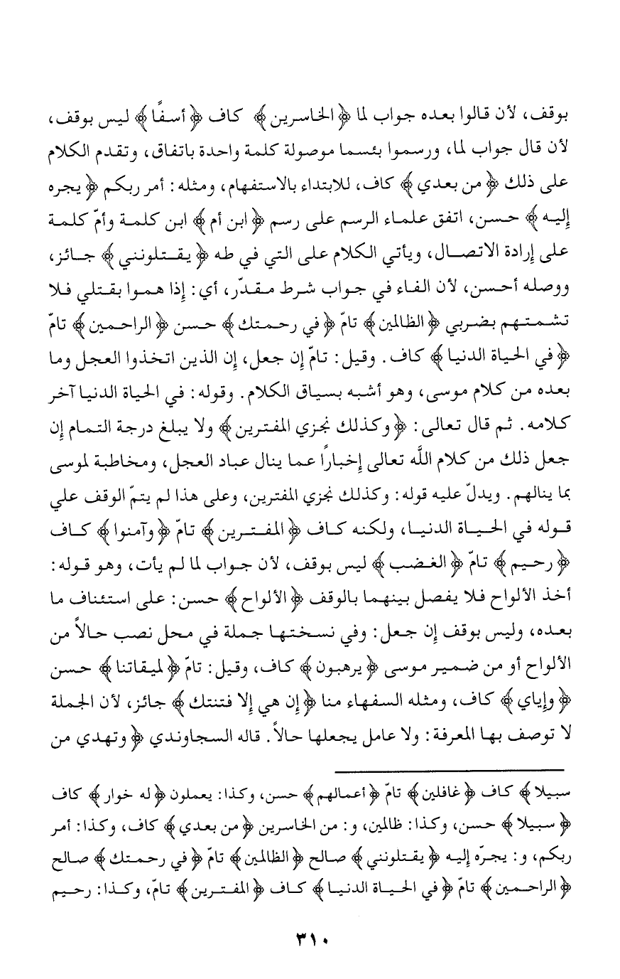 أخذ الألواح فلا يفصل بينهما بالوقف الْأَلْواحَ حسن: على استئناف ما بعده، وليس بوقف إن جعل: وفي نسختها جملة في محل نصب حالا من الألواح أو من ضمير موسى يَرْهَبُونَ كاف، وقيل: تامّ لِمِيقاتِنا حسن وَإِيَّايَ كاف، ومثله السفهاء منا إِنْ هِيَ إِلَّا فِتْنَتُكَ جائز، لأن الجملة لا توصف بها المعرفة: ولا عامل يجعلها حالا. قاله السجاوندي وَتَهْدِي مَنْ