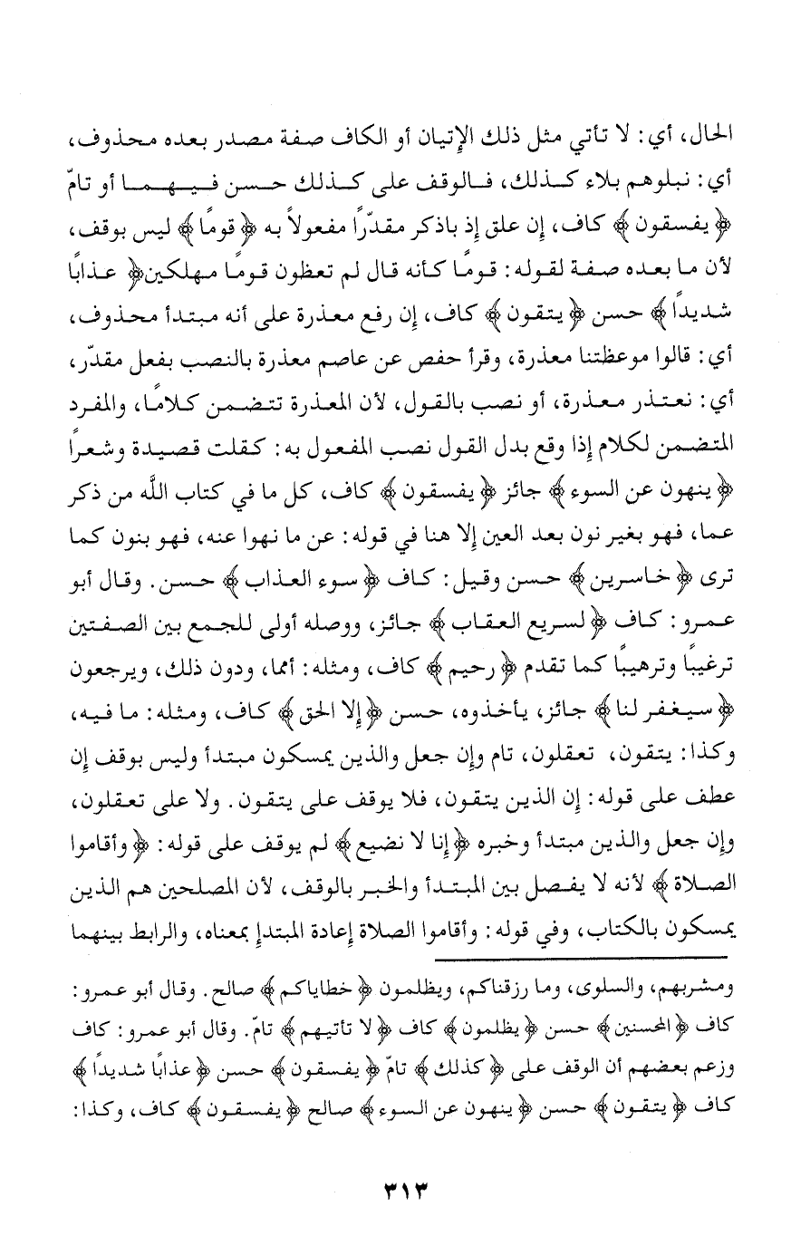 الحال، أي: لا تأتي مثل ذلك الإتيان أو الكاف صفة مصدر بعده محذوف، أي: نبلوهم بلاء كذلك، فالوقف على كذلك حسن فيهما أو تامّ يَفْسُقُونَ كاف، إن علق إذ باذكر مقدّرا مفعولا به قَوْماً ليس بوقف، لأن ما بعده صفة لقوله: قوما كأنه قال لم تعظون قوما مهلكين عَذاباً شَدِيداً حسن يَتَّقُونَ كاف، إن رفع معذرة على أنه مبتدأ محذوف، أي: قالوا موعظتنا معذرة، وقرأ حفص عن عاصم معذرة بالنصب بفعل مقدّر، أي: نعتذر معذرة، أو نصب بالقول، لأن المعذرة تتضمن كلاما، والمفرد المتضمن لكلام إذا وقع بدل القول نصب المفعول به: كقلت قصيدة وشعرا يَنْهَوْنَ عَنِ السُّوءِ جائز يَفْسُقُونَ كاف، كل ما في كتاب الله من ذكر عما، فهو بغير نون بعد العين إلا هنا في قوله: عن ما نهوا عنه، فهو ينون كما ترى خاسِئِينَ حسن وقيل: كاف سُوءَ الْعَذابِ حسن. وقال أبو عمرو: كاف لَسَرِيعُ الْعِقابِ جائز، ووصله أولى للجمع بين الصفتين ترغيبا وترهيبا كما تقدم رَحِيمٌ كاف، ومثله: أمما، ودون ذلك، ويرجعون سَيُغْفَرُ لَنا جائز، يأخذوه، حسن إِلَّا الْحَقَّ كاف، ومثله: ما فيه، وكذا: يتقون، تعقلون، تام وإن جعل والذين يمسكون مبتدأ وليس بوقف إن عطف على قوله: إن الذين يتقون، فلا يوقف على يتقون. ولا على تعقلون، وإن جعل والذين مبتدأ وخبره إِنَّا لا نُضِيعُ لم يوقف على قوله: وَأَقامُوا الصَّلاةَ لأنه لا يفصل بين المبتدأ والخبر بالوقف، لأن المصلحين هم الذين يمسكون بالكتاب، وفي قوله: وأقاموا الصلاة إعادة المبتدإ بمعناه، والرابط بينهما