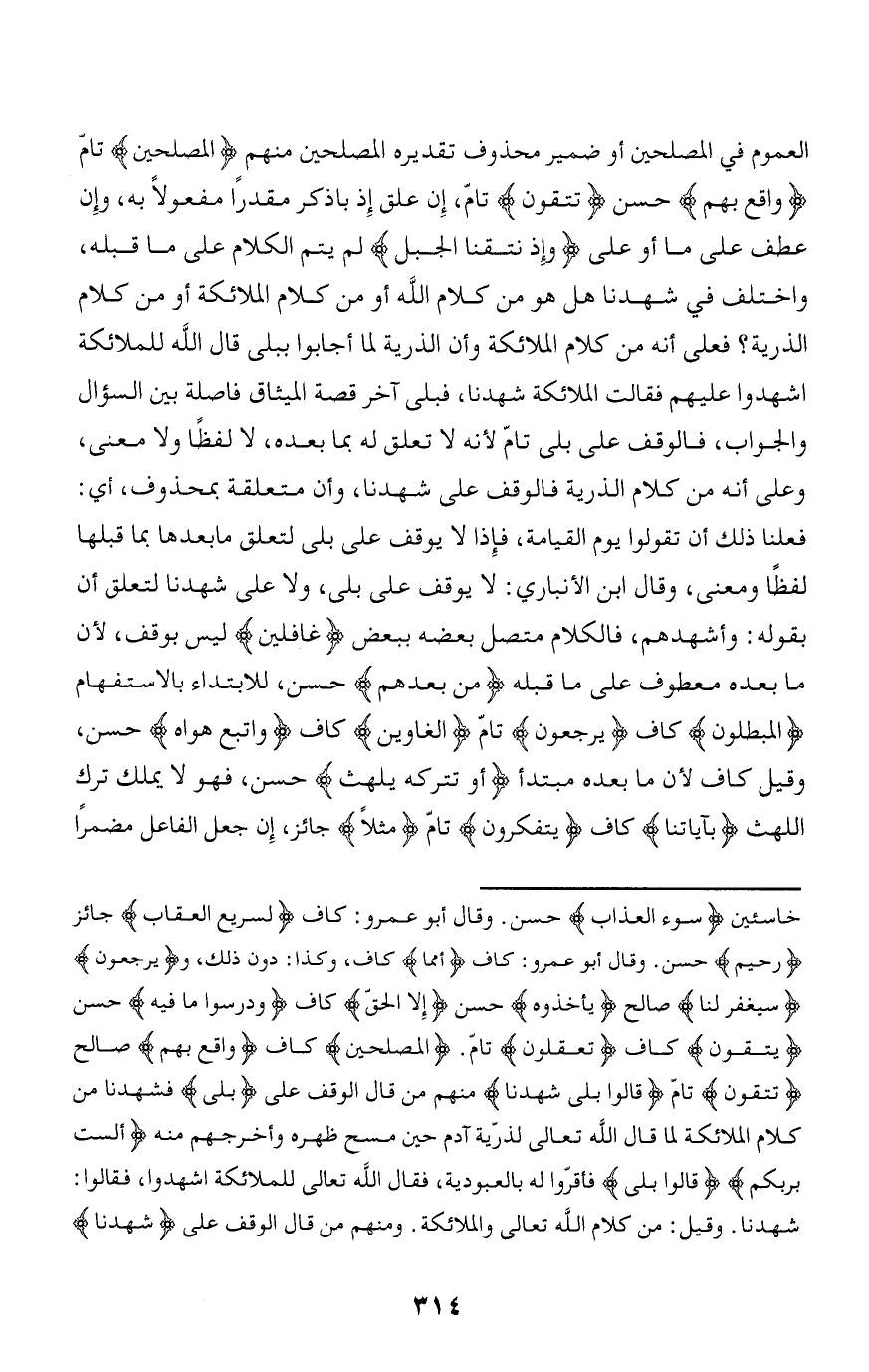 خاسئين سُوءَ الْعَذابِ حسن. وقال أبو عمرو: كاف لَسَرِيعُ الْعِقابِ جائز رَحِيمٌ حسن. وقال أبو عمرو: كاف أُمَماً كاف، وكذا: دون ذلك، ويَرْجِعُونَ سَيُغْفَرُ لَنا صالح يَأْخُذُوهُ حسن إِلَّا الْحَقَّ كاف وَدَرَسُوا ما فِيهِ حسن يَتَّقُونَ كاف تَعْقِلُونَ تامّ. الْمُصْلِحِينَ كاف واقِعٌ بِهِمْ صالح تَتَّقُونَ تامّ قالُوا بَلى شَهِدْنا منهم من قال الوقف على بَلى فشهدنا من كلام الملائكة لما قال الله تعالى لذرّية آدم حين مسح ظهره وأخرجهم منه أَلَسْتُ بِرَبِّكُمْ قالُوا بَلى فأقرّوا له بالعبودية، فقال الله تعالى للملائكة اشهدوا، فقالوا: