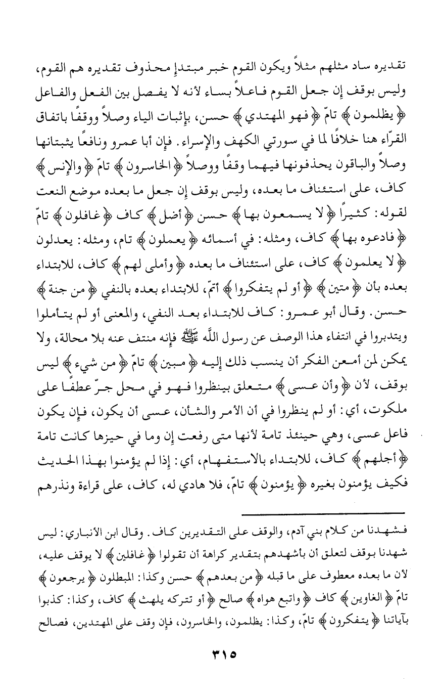 تقديره ساد مثلهم مثلا ويكون القوم خبر مبتدإ محذوف تقديره هم القوم، وليس بوقف إن جعل القوم فاعلا بساء لأنه لا يفصل بين الفعل والفاعل يَظْلِمُونَ تامّ فَهُوَ الْمُهْتَدِي حسن، بإثبات الياء وصلا ووقفا باتفاق القرّاء هنا خلافا لما في سورتي الكهف والإسراء. فإن أبا عمرو ونافعا يثبتانها وصلا والباقون يحذفونها فيهما وقفا ووصلا الْخاسِرُونَ تامّ وَالْإِنْسِ كاف، على استئناف ما بعده، وليس بوقف إن جعل ما بعده موضع النعت لقوله: كثيرا لا يَسْمَعُونَ بِها حسن أَضَلُّ كاف (غافلون) تامّ فَادْعُوهُ بِها كاف، ومثله: في أسمائه يَعْمَلُونَ تام، ومثله: يعدلون لا يَعْلَمُونَ كاف، على استئناف ما بعده وَأُمْلِي لَهُمْ كاف، للابتداء بعده بأن مَتِينٌ أَوَلَمْ يَتَفَكَّرُوا أتمّ، للابتداء بعده بالنفي مِنْ جِنَّةٍ حسن. وقال أبو عمرو: كاف للابتداء بعد النفي، والمعنى أولم يتأملوا ويتدبروا في انتفاء هذا الوصف عن رسول الله صلّى الله عليه وسلّم فإنه منتف عنه بلا محالة، ولا يمكن لمن أمعن الفكر أن ينسب ذلك إليه مُبِينٌ تامّ مِنْ شَيْءٍ ليس بوقف، لأن وَأَنْ عَسى متعلق بينظروا فهو في محل جرّ عطفا على ملكوت، أي: أو لم ينظروا في أن الأمر والشأن، عسى أن يكون، فإن يكون فاعل عسى، وهي حينئذ تامة لأنها متى رفعت إن وما في حيزها كانت تامة أَجَلُهُمْ كاف، للابتداء بالاستفهام، أي: إذا لم يؤمنوا بهذا الحديث فكيف يؤمنون بغيره يُؤْمِنُونَ تامّ، فلا هادي له، كاف، على قراءة ونذرهم