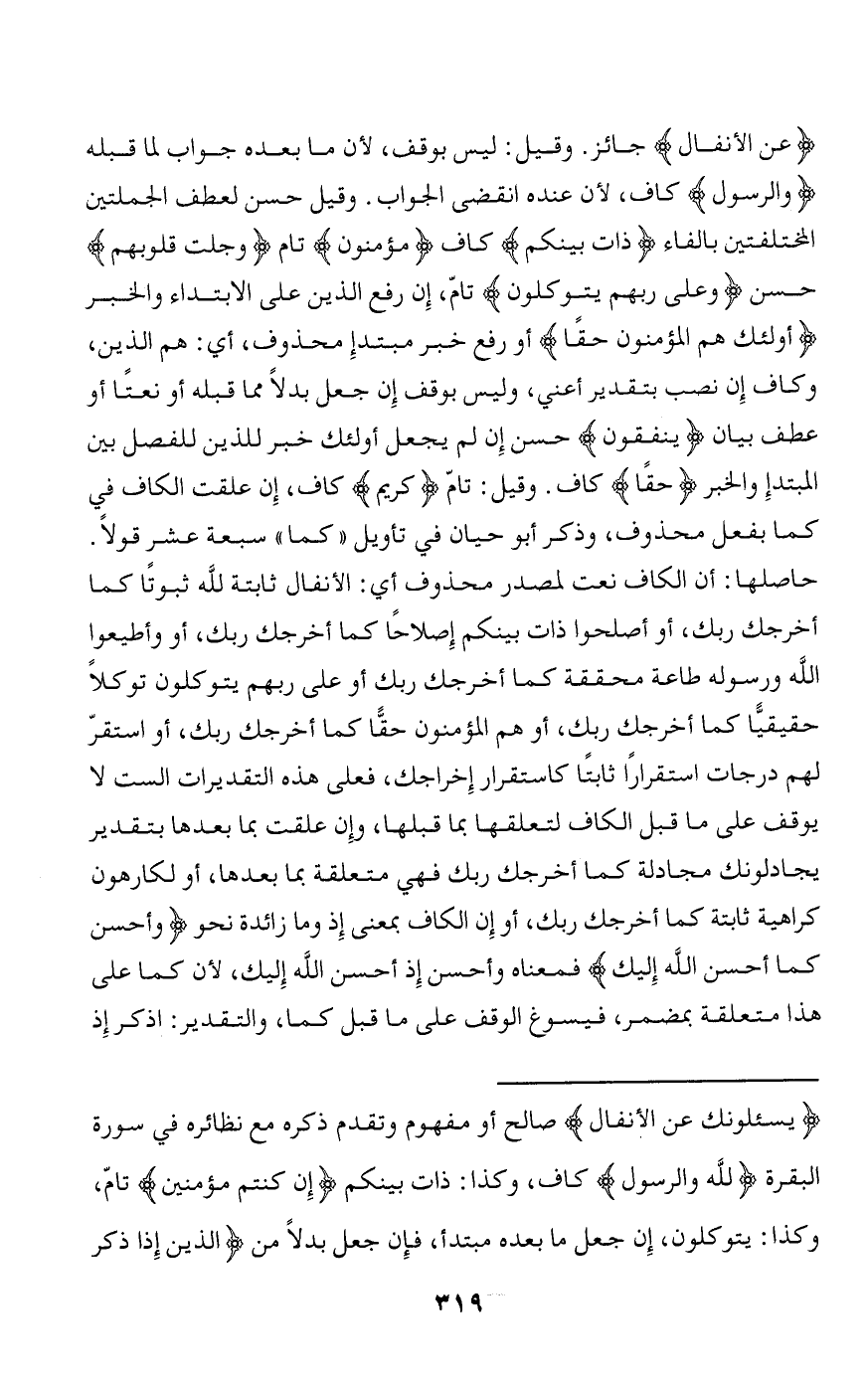 محققة كما أخرجك ربك أو على ربهم يتوكلون توكلا حقيقيّا كما أخرجك ربك، أو هم المؤمنون حقّا كما أخرجك ربك، أو استقرّ لهم درجات استقرارا ثابتا كاستقرار إخراجك، فعلى هذه التقديرات الست لا يوقف على ما قبل الكاف لتعلقها بما قبلها، وإن علقت بما بعدها بتقدير يجادلونك مجادلة كما أخرجك ربك فهي متعلقة بما بعدها، أو لكارهون كراهية ثابتة كما أخرجك ربك، أو إن الكاف بمعنى إذ وما زائدة نحو وَأَحْسِنْ كَما أَحْسَنَ اللَّهُ إِلَيْكَ فمعناه وأحسن إذ أحسن الله إليك، لأن كما على هذا متعلقة بمضمر، فيسوغ الوقف على ما قبل كما، والتقدير: اذكر إذ