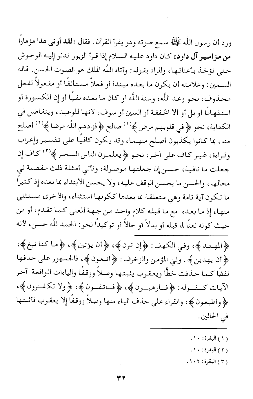ورد أن رسول الله صلّى الله عليه وسلّم سمع صوته وهو يقرأ القرآن. فقال «لقد أوتي هذا مزمارا من مزامير آل داود» كان داود عليه السلام إذا قرأ الزبور تدنو إليه الوحوش حتى تؤخذ بأعناقها، والمراد بقوله: وآتاه الله الملك هو الصوت الحسن. قاله السمين: وعلامته أن يكون ما بعده مبتدأ أو فعلا مستأنفا أو مفعولا لفعل محذوف، نحو وعد الله، وسنة الله أو كان ما بعده نفيا أو إن المكسورة أو استفهاما أو بل أو ألا المخففة أو السين أو سوف، لأنها للوعيد، ويتفاضل في الكفاية، نحو فِي قُلُوبِهِمْ مَرَضٌ (¬1) صالح فَزادَهُمُ اللَّهُ مَرَضاً (¬2) أصلح منه، بما كانوا يكذبون أصلح منهما، وقد يكون كافيا على تفسير وإعراب وقراءة، غير كاف على آخر، نحو يُعَلِّمُونَ النَّاسَ السِّحْرَ (¬3) كاف إن جعلت ما نافية، حسن إن جعلتها موصولة، وتأتي أمثلة ذلك مفصلة في محالها، والحسن ما يحسن الوقف عليه، ولا يحسن الابتداء بما بعده إذ كثيرا ما تكون آية تامة وهي متعلقة بما بعدها ككونها استثناء، والأخرى مستثنى منها، إذ ما بعده مع ما قبله كلام واحد من جهة المعنى كما تقدم، أو من حيث كونه نعتا لما قبله أو بدلا أو حالا أو توكيدا نحو: الحمد لله حسن، لأنه