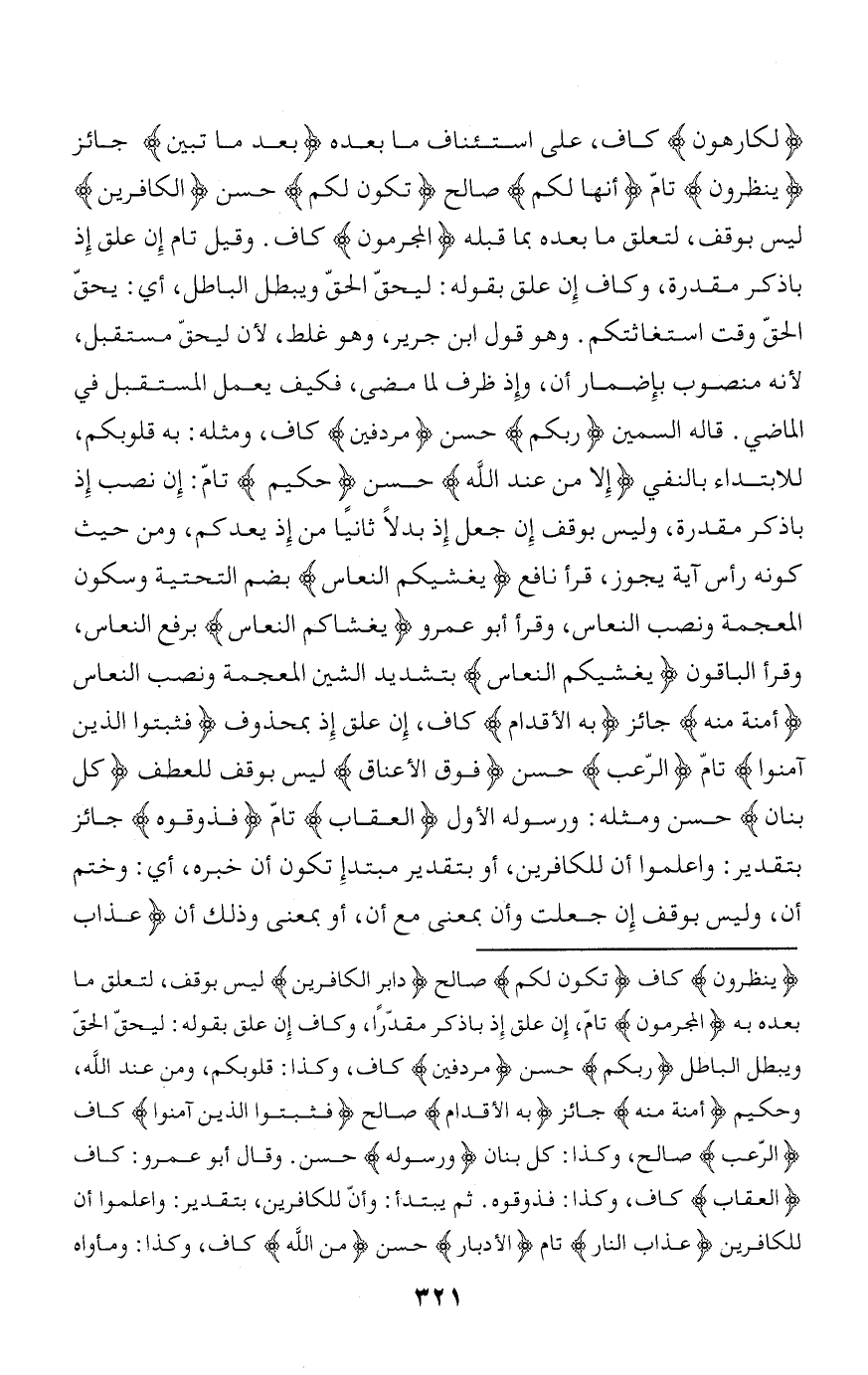 لَكارِهُونَ كاف، على استئناف ما بعده بَعْدَ ما تَبَيَّنَ جائز يَنْظُرُونَ تامّ أَنَّها لَكُمْ صالح تَكُونُ لَكُمْ حسن الْكافِرِينَ ليس بوقف، لتعلق ما بعده بما قبله الْمُجْرِمُونَ كاف. وقيل تام إن علق إذ باذكر مقدرة، وكاف إن علق بقوله: ليحقّ الحقّ ويبطل الباطل، أي: يحقّ الحقّ وقت استغاثتكم. وهو قول ابن جرير، وهو غلط، لأن ليحقّ مستقبل، لأنه منصوب بإضمار أن، وإذ ظرف لما مضى، فكيف يعمل المستقبل في الماضي. قاله السمين رَبَّكُمْ حسن مُرْدِفِينَ كاف، ومثله: به قلوبكم، للابتداء بالنفي إِلَّا مِنْ عِنْدِ اللَّهِ حسن حَكِيمٌ تامّ: إن نصب إذ باذكر مقدرة، وليس بوقف إن جعل إذ بدلا ثانيا من إذ يعدكم، ومن حيث كونه رأس آية يجوز، قرأ نافع يُغَشِّيكُمُ النُّعاسَ بضم التحتية وسكون المعجمة ونصب النعاس، وقرأ أبو عمرو يُغَشِّيكُمُ النُّعاسَ برفع النعاس، وقرأ الباقون يُغَشِّيكُمُ النُّعاسَ بتشديد الشين المعجمة ونصب النعاس أَمَنَةً مِنْهُ جائز بِهِ الْأَقْدامَ كاف، إن علق إذ بمحذوف فَثَبِّتُوا الَّذِينَ آمَنُوا تامّ الرُّعْبَ حسن فَوْقَ الْأَعْناقِ ليس بوقف للعطف كُلَّ بَنانٍ حسن ومثله: ورسوله الأول الْعِقابِ تامّ فَذُوقُوهُ جائز بتقدير: واعلموا أن للكافرين، أو بتقدير مبتدإ تكون أن خبره، أي: وختم أن، وليس بوقف إن جعلت وأن بمعنى مع أن، أو بمعنى وذلك أن عَذابَ