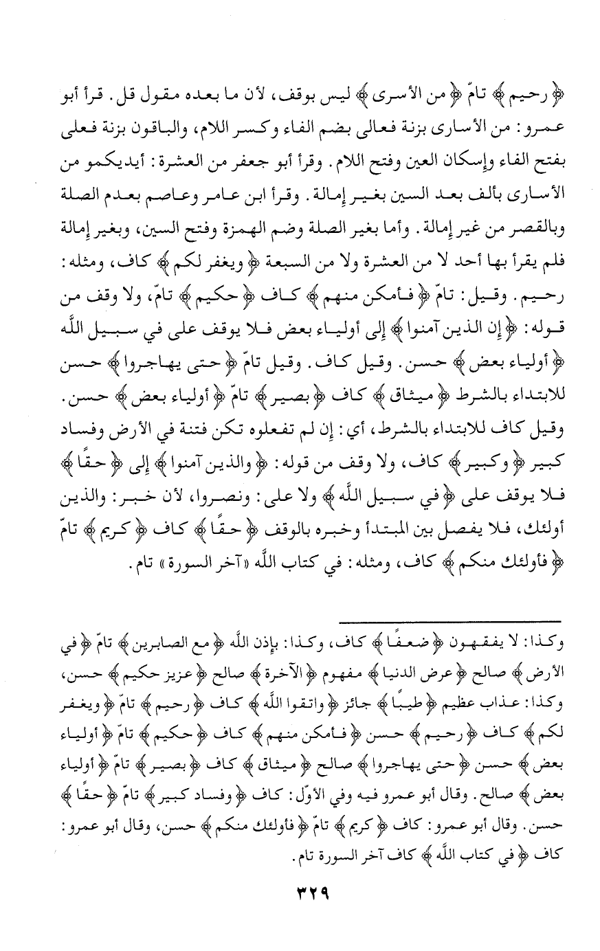 وقيل كاف للابتداء بالشرط، أي: إن لم تفعلوه تكن فتنة في الأرض وفساد كبير وكَبِيرٌ كاف، ولا وقف من قوله: وَالَّذِينَ آمَنُوا إلى حَقًّا فلا يوقف على فِي سَبِيلِ اللَّهِ ولا على: ونصروا، لأن خبر: والذين أولئك، فلا يفصل بين المبتدأ وخبره بالوقف حَقًّا كاف كَرِيمٌ تامّ فَأُولئِكَ مِنْكُمْ كاف، ومثله: في كتاب الله «آخر السورة» تام.