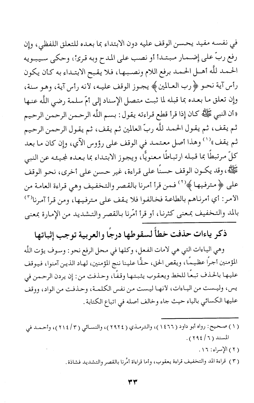 في نفسه مفيد يحسن الوقف عليه دون الابتداء بما بعده للتعلق اللفظي، وإن رفع ربّ على إضمار مبتدأ أو نصب على المدح وبه قرئ، وحكى سيبويه الحمد لله أهل الحمد برفع اللام ونصبها، فلا يقبح الابتداء به كأن يكون رأس آية نحو رَبِّ الْعالَمِينَ* يجوز الوقف عليه، لأنه رأس آية، وهو سنة، وإن تعلق ما بعده بما قبله لما ثبت متصل الإسناد إلى أمّ سلمة رضي الله عنها «أن النبي صلّى الله عليه وسلّم كان إذا قرأ قطع قراءته يقول: بسم الله الرحمن الرحمن الرحيم ثم يقف، ثم يقول الحمد لله ربّ العالمين ثم يقف، ثم يقول الرحمن الرحيم ثم يقف» (¬1) وهذا أصل معتمد في الوقف على رءوس الآي، وإن كان ما بعد كلّ مرتبطا بما قبله ارتباطا معنويّا، ويجوز الابتداء بما بعده لمجيئه عن النبي صلّى الله عليه وسلّم، وقد يكون الوقف حسنا على قراءة، غير حسن على أخرى، نحو الوقف على مُتْرَفِيها (¬2) فمن قرأ أمرنا بالقصر والتخفيف وهي قراءة العامة من الأمر: أي أمرناهم بالطاعة فخالفوا فلا يقف على مترفيها، ومن قرأ آمرنا (¬3) بالمد والتخفيف بمعنى كثرنا، أو قرأ أمّرنا بالقصر والتشديد من الإمارة بمعنى