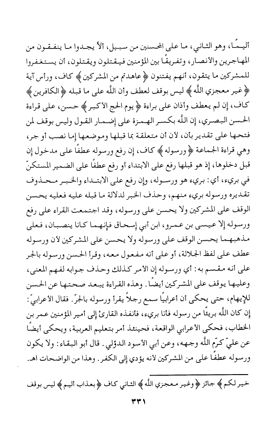 إن كان الله بريئا من رسوله فأنا بريء، فأنفذه القارئ إلى أمير المؤمنين عمر بن الخطاب، فحكى الأعرابي الواقعة، فحينئذ أمر بتعليم العربية، ويحكى أيضا عن عليّ كرّم الله وجهه، وعن أبي الأسود الدؤلي. قال أبو البقاء: ولا يكون ورسوله عطفا على من المشركين لأنه يؤدي إلى الكفر. وهذا من الواضحات اه.