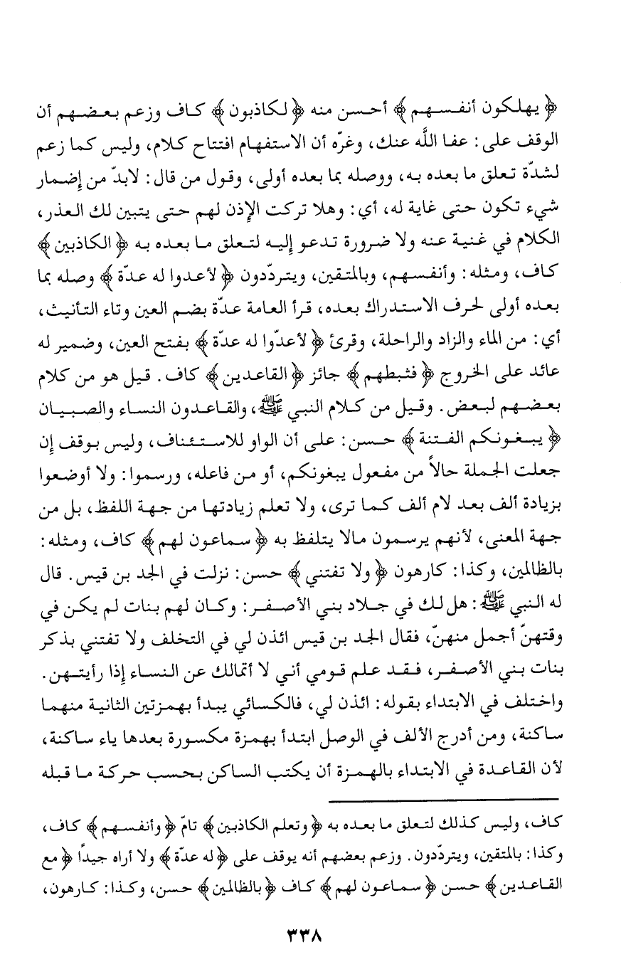 يُهْلِكُونَ أَنْفُسَهُمْ أحسن منه لَكاذِبُونَ كاف وزعم بعضهم أن الوقف على: عفا الله عنك، وغرّه أن الاستفهام افتتاح كلام، وليس كما زعم لشدّة تعلق ما بعده به، ووصله بما بعده أولى، وقول من قال: لا بدّ من إضمار شيء تكون حتى غاية له، أي: وهلا تركت الإذن لهم حتى يتبين لك العذر، الكلام في غنية عنه ولا ضرورة تدعو إليه لتعلق ما بعده به الْكاذِبِينَ كاف، ومثله: وأنفسهم، وبالمتقين، ويتردّدون لَأَعَدُّوا لَهُ عُدَّةً وصله بما بعده أولى لحرف الاستدراك بعده، قرأ العامة عدّة بضم العين وتاء التأنيث، أي: من الماء والزاد والراحلة، وقرئ لَأَعَدُّوا لَهُ عُدَّةً بفتح العين، وضمير له عائد على الخروج فَثَبَّطَهُمْ جائز الْقاعِدِينَ كاف. قيل هو من كلام بعضهم لبعض. وقيل من كلام النبي صلّى الله عليه وسلّم، والقاعدون النساء والصبيان يَبْغُونَكُمُ الْفِتْنَةَ حسن: على أن الواو للاستئناف، وليس بوقف إن جعلت الجملة حالا من مفعول يبغونكم، أو من فاعله، ورسموا: ولا أوضعوا بزيادة ألف بعد لام ألف كما ترى، ولا تعلم زيادتها من جهة اللفظ، بل من جهة المعنى، لأنهم يرسمون ما لا يتلفظ به سَمَّاعُونَ لَهُمْ كاف، ومثله: