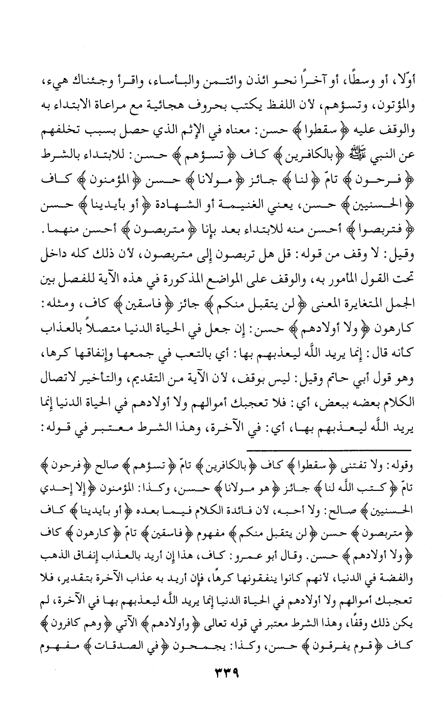 وقوله: ولا تفتنى سَقَطُوا كاف بِالْكافِرِينَ تامّ تَسُؤْهُمْ صالح فَرِحُونَ تامّ كَتَبَ اللَّهُ لَنا جائز هُوَ مَوْلانا حسن، وكذا: المؤمنون إِلَّا إِحْدَى الْحُسْنَيَيْنِ صالح: ولا أحبه، لأن فائدة الكلام فيما بعده أَوْ بِأَيْدِينا كاف مُتَرَبِّصُونَ حسن لَنْ يُتَقَبَّلَ مِنْكُمْ مفهوم فاسِقِينَ تامّ كارِهُونَ كاف وَلا أَوْلادُهُمْ حسن. وقال أبو عمرو: كاف، هذا إن أريد بالعذاب إنفاق الذهب والفضة في الدنيا، لأنهم كانوا ينفقونها كرها، فإن أريد به عذاب الآخرة بتقدير، فلا تعجبك أموالهم ولا أولادهم في الحياة الدنيا إنما يريد الله ليعذبهم بها في الآخرة، لم يكن ذلك وقفا، وهذا الشرط معتبر في قوله تعالى وَأَوْلادُهُمْ الآتي وَهُمْ كافِرُونَ كاف قَوْمٌ يَفْرَقُونَ حسن، وكذا: يجمحون فِي الصَّدَقاتِ مفهوم