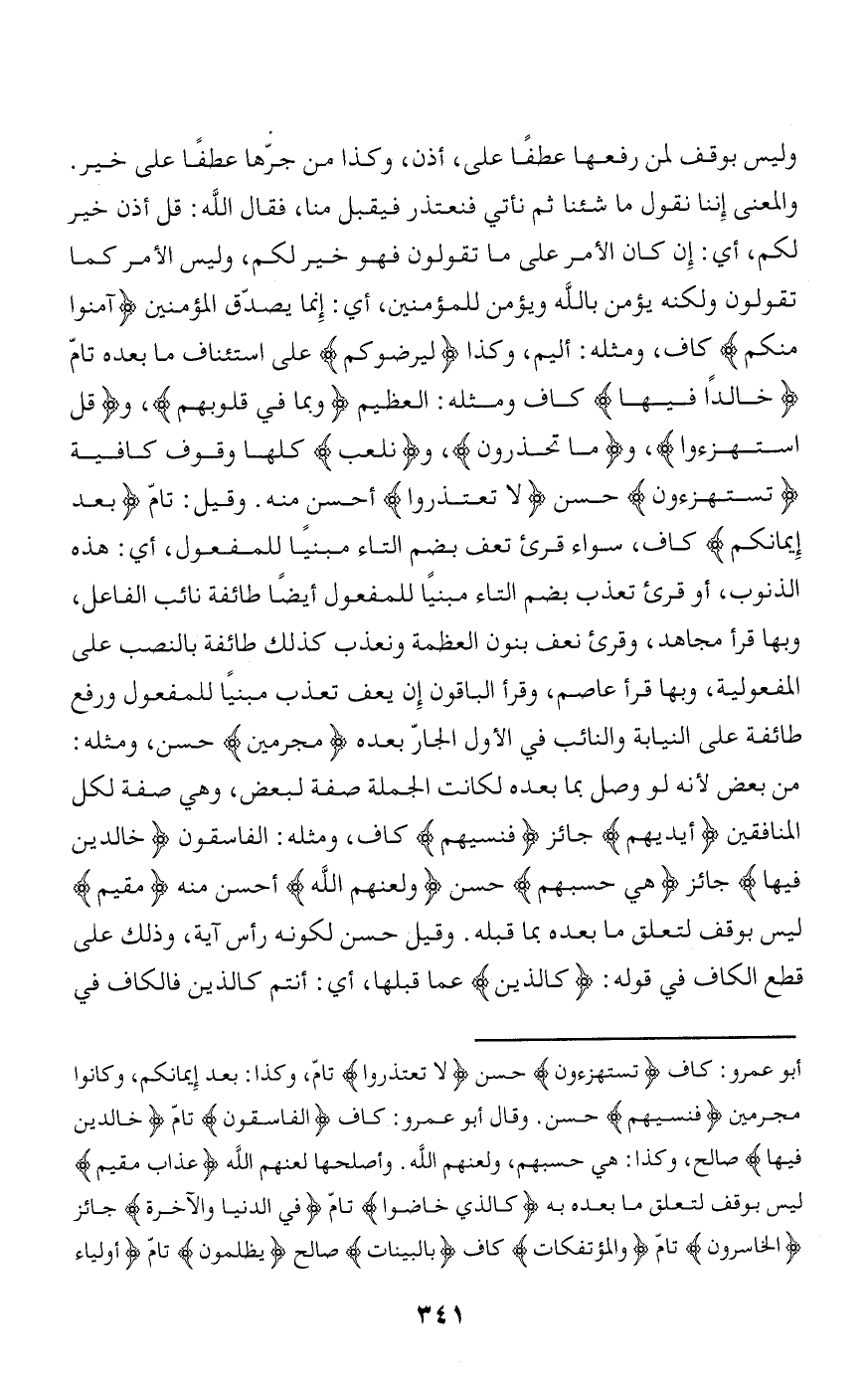 أبو عمرو: كاف تَسْتَهْزِؤُنَ حسن لا تَعْتَذِرُوا تامّ، وكذا: بعد إيمانكم، وكانوا مجرمين فَنَسِيَهُمْ حسن. وقال أبو عمرو: كاف الْفاسِقُونَ تامّ خالِدِينَ فِيها صالح، وكذا: هي حسبهم، ولعنهم الله. وأصلحها لعنهم الله عَذابٌ مُقِيمٌ ليس بوقف لتعلق ما بعده به كَالَّذِي خاضُوا تامّ فِي الدُّنْيا وَالْآخِرَةِ جائز الْخاسِرُونَ تامّ وَالْمُؤْتَفِكاتِ كاف بِالْبَيِّناتِ صالح يَظْلِمُونَ تامّ أَوْلِياءُ