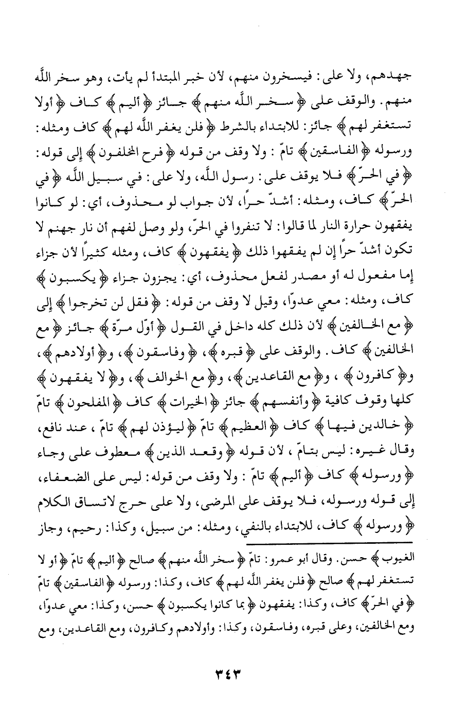الْغُيُوبِ حسن. وقال أبو عمرو: تامّ سَخِرَ اللَّهُ مِنْهُمْ صالح أَلِيمٌ تامّ أَوْ لا تَسْتَغْفِرْ لَهُمْ صالح فَلَنْ يَغْفِرَ اللَّهُ لَهُمْ كاف، وكذا: ورسوله الْفاسِقِينَ تامّ فِي الْحَرِّ كاف، وكذا: يفقهون بِما كانُوا يَكْسِبُونَ حسن، وكذا: معي عدوّا، ومع الخالفين، وعلى قبره، وفاسقون، وكذا: وأولادهم وكافرون، ومع القاعدين، ومع