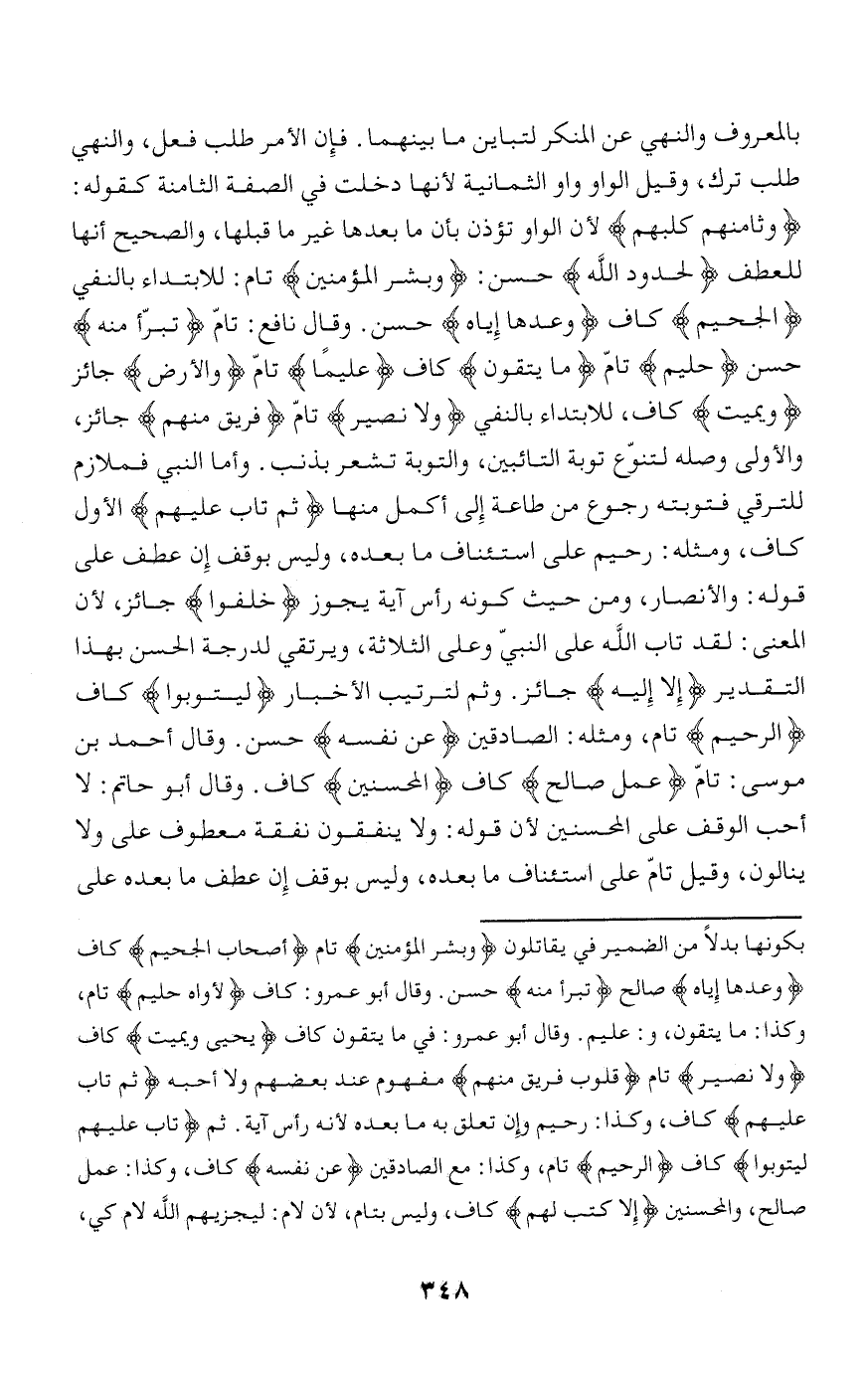 وَثامِنُهُمْ كَلْبُهُمْ لأن الواو تؤذن بأن ما بعدها غير ما قبلها، والصحيح أنها للعطف لِحُدُودِ اللَّهِ حسن: وَبَشِّرِ الْمُؤْمِنِينَ تام: للابتداء بالنفي الْجَحِيمِ كاف وَعَدَها إِيَّاهُ حسن. وقال نافع: تامّ تَبَرَّأَ مِنْهُ حسن حَلِيمٌ تامّ ما يَتَّقُونَ كاف عَلِيمٌ تامّ وَالْأَرْضِ جائز وَيُمِيتُ كاف، للابتداء بالنفي وَلا نَصِيرٍ تامّ فَرِيقٍ مِنْهُمْ جائز، والأولى وصله لتنوّع توبة التائبين، والتوبة تشعر بذنب. وأما النبي فملازم للترقي فتوبته رجوع من طاعة إلى أكمل منها ثُمَّ تابَ عَلَيْهِمْ الأول كاف، ومثله: رحيم على استئناف ما بعده، وليس بوقف إن عطف على قوله: والأنصار، ومن حيث كونه رأس آية يجوز خُلِّفُوا جائز، لأن المعنى: لقد تاب الله على النبيّ وعلى الثلاثة، ويرتقي لدرجة الحسن بهذا التقدير إِلَّا إِلَيْهِ جائز. وثم لترتيب الأخبار لِيَتُوبُوا كاف الرَّحِيمُ تام، ومثله: الصادقين عَنْ نَفْسِهِ حسن. وقال أحمد بن موسى: تامّ عَمَلٌ صالِحٌ كاف الْمُحْسِنِينَ كاف. وقال أبو حاتم: لا أحب الوقف على المحسنين لأن قوله: ولا ينفقون نفقة معطوف على ولا ينالون، وقيل تامّ على استئناف ما بعده، وليس بوقف إن عطف ما بعده على