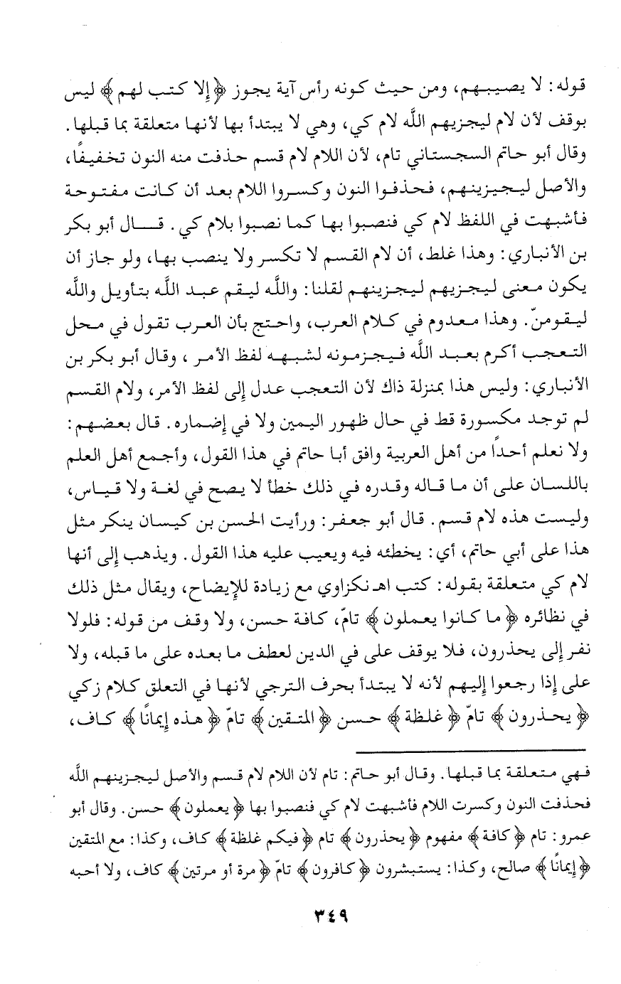 ولا نعلم أحدا من أهل العربية وافق أبا حاتم في هذا القول، وأجمع أهل العلم باللسان على أن ما قاله وقدره في ذلك خطأ لا يصح في لغة ولا قياس، وليست هذه لام قسم. قال أبو جعفر: ورأيت الحسن بن كيسان ينكر مثل هذا على أبي حاتم، أي: يخطئه فيه ويعيب عليه هذا القول. ويذهب إلى أنها لام كي متعلقة بقوله: كتب اه نكزاوي مع زيادة للإيضاح، ويقال مثل ذلك في نظائره ما كانُوا يَعْمَلُونَ تامّ، كافة حسن، ولا وقف من قوله: فلولا نفر إلى يحذرون، فلا يوقف على في الدين لعطف ما بعده على ما قبله، ولا على إذا رجعوا إليهم لأنه لا يبتدأ بحرف الترجي لأنها في التعلق كلام زكي يَحْذَرُونَ تامّ غِلْظَةً حسن الْمُتَّقِينَ تامّ هذِهِ إِيماناً كاف،