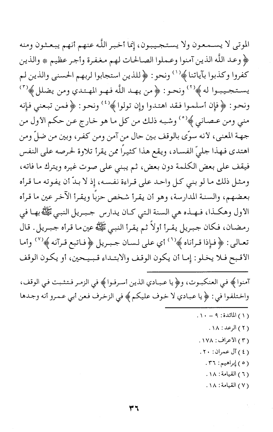 الموتى لا يسمعون ولا يستجيبون، إنما أخبر الله عنهم أنهم يبعثون ومنه وَعَدَ اللَّهُ الَّذِينَ آمَنُوا وَعَمِلُوا الصَّالِحاتِ لَهُمْ مَغْفِرَةٌ وَأَجْرٌ عَظِيمٌ* وَالَّذِينَ كَفَرُوا وَكَذَّبُوا بِآياتِنا (¬1) ونحو: لِلَّذِينَ اسْتَجابُوا لِرَبِّهِمُ الْحُسْنى وَالَّذِينَ لَمْ يَسْتَجِيبُوا لَهُ (¬2) ونحو: مَنْ يَهْدِ اللَّهُ فَهُوَ الْمُهْتَدِي وَمَنْ يُضْلِلْ (¬3) ونحو: فَإِنْ أَسْلَمُوا فَقَدِ اهْتَدَوْا وَإِنْ تَوَلَّوْا (¬4) ونحو: فَمَنْ تَبِعَنِي فَإِنَّهُ مِنِّي وَمَنْ عَصانِي (¬5) وشبه ذلك من كل ما هو خارج عن حكم الأول من جهة المعنى، لأنه سوّى بالوقف بين حال من آمن ومن كفر، وبين من ضلّ ومن اهتدى فهذا جليّ الفساد، ويقع هذا كثيرا ممن يقرأ تلاوة لحرصه على النفس فيقف على بعض الكلمة دون بعض، ثم يبني على صوت غيره ويترك ما فاته، ومثل ذلك ما لو بني كل واحد على قراءة نفسه، إذ لا بدّ أن يفوته ما قرأه بعضهم، والسنة المدارسة، وهو أن يقرأ شخص حزبا ويقرأ الآخر عين ما قرأه الأول وهكذا، فهذه هي السنة التي كان يدارس جبريل النبي صلّى الله عليه وسلّم بها في رمضان، فكان جبريل يقرأ أولا ثم يقرأ النبي صلّى الله عليه وسلّم عين ما قرأه جبريل. قال تعالى: فَإِذا قَرَأْناهُ (¬6) أي على لسان جبريل فَاتَّبِعْ قُرْآنَهُ (¬7) وأما الأقبح فلا يخلو: إما أن يكون الوقف والابتداء قبيحين، أو يكون الوقف