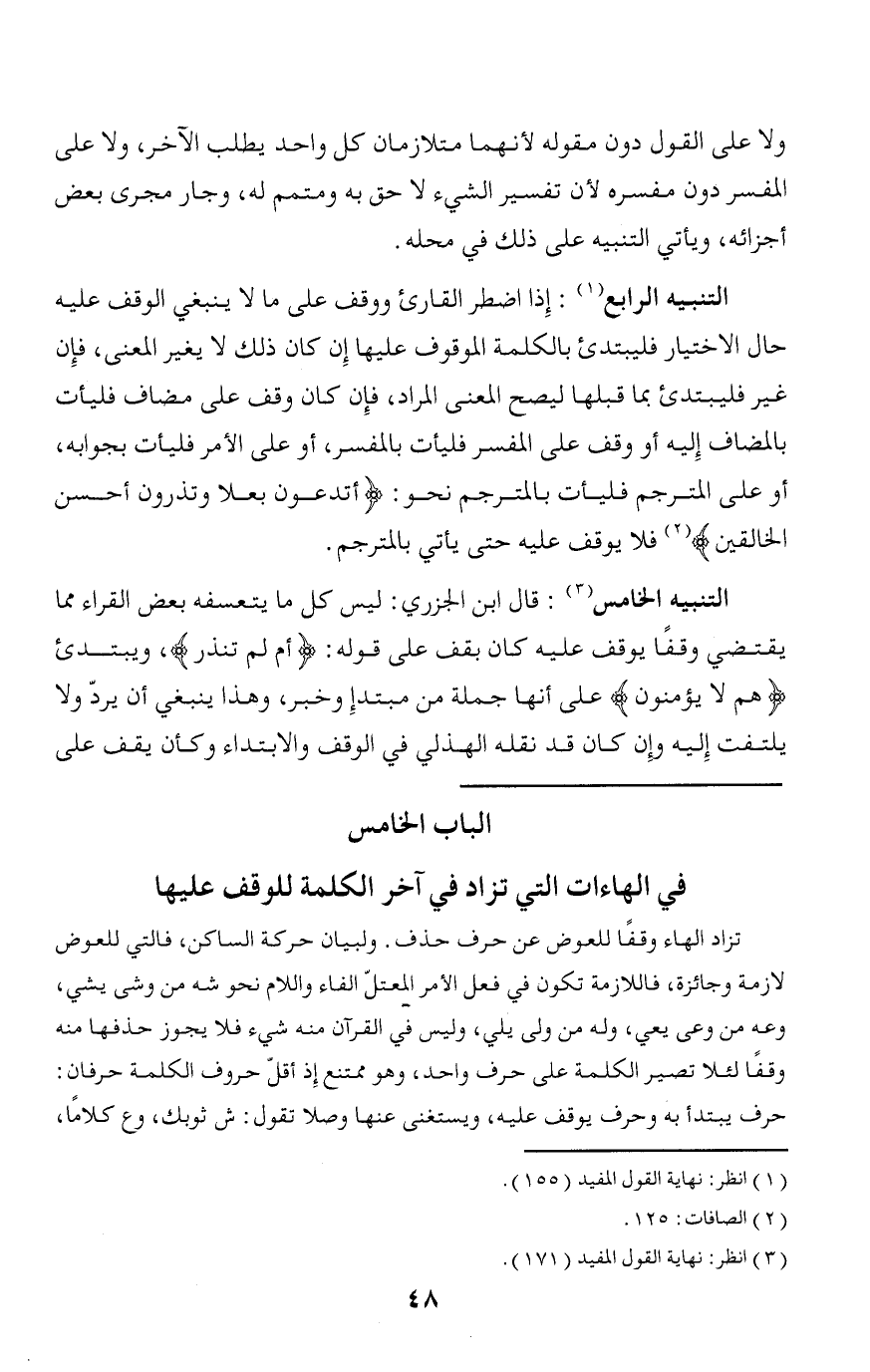 الباب الخامس في الهاءات التي تزاد في آخر الكلمة للوقف عليها تزاد الهاء وقفا للعوض عن حرف حذف. ولبيان حركة الساكن، فالتي للعوض لازمة وجائزة، فاللازمة تكون في فعل الأمر المعتلّ الفاء واللام نحو شه من وشى يشي، وعه من وعى يعي، وله من ولى يلي، وليس في القرآن منه شيء فلا يجوز حذفها منه وقفا لئلا تصير الكلمة على حرف واحد، وهو ممتنع إذ أقلّ حروف الكلمة حرفان:
