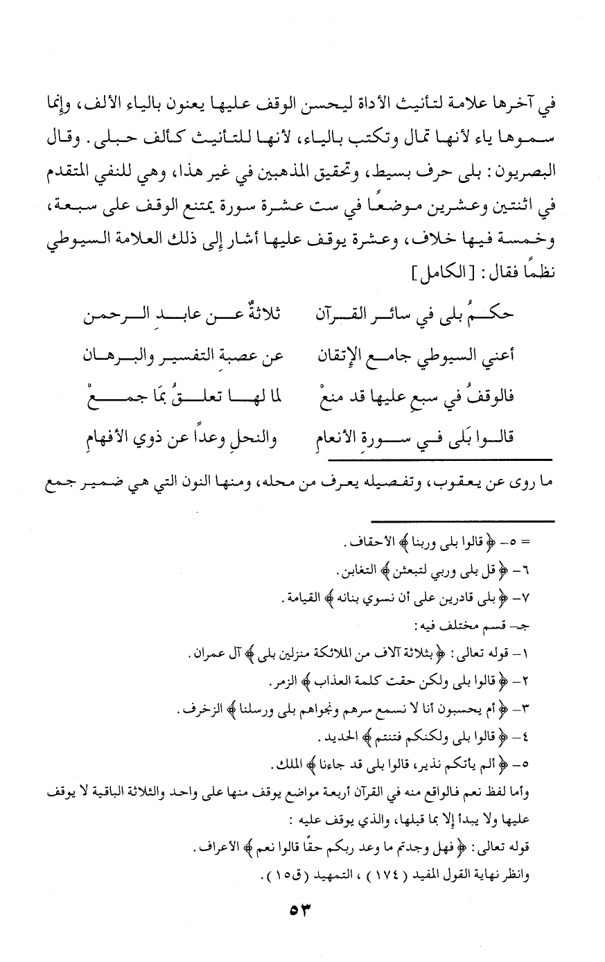 في آخرها علامة لتأنيث الأداة ليحسن الوقف عليها يعنون بالياء الألف، وإنما سموها ياء لأنها تمال وتكتب بالياء، لأنها للتأنيث كألف حبلى. وقال البصريون: بلى حرف بسيط، وتحقيق المذهبين في غير هذا، وهي للنفي المتقدم في اثنتين وعشرين موضعا في ست عشرة سورة يمتنع الوقف على سبعة، وخمسة فيها خلاف، وعشرة يوقف عليها أشار إلى ذلك العلامة السيوطي نظما فقال: [الكامل]