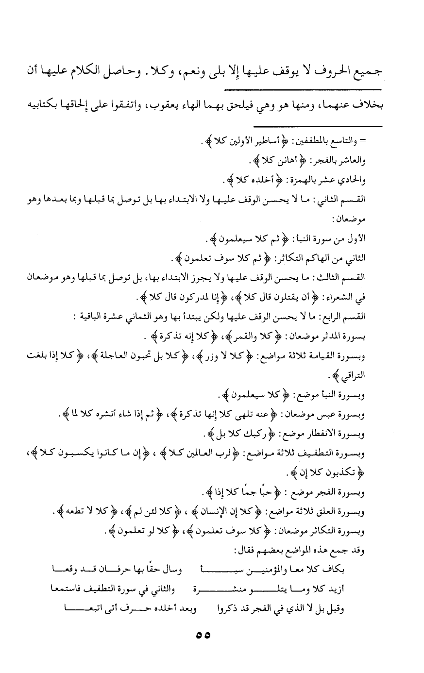 القسم الثالث: ما يحسن الوقف عليها ولا يجوز الابتداء بها، بل توصل بما قبلها وهو موضعان في الشعراء: أَنْ يَقْتُلُونِ قالَ كَلَّا، إِنَّا لَمُدْرَكُونَ قالَ كَلَّا.
