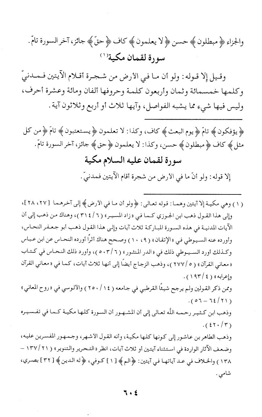 وقيل إلا قوله: ولو أن ما في الأرض من شجرة أقلام الآيتين فمدنيّ وكلمها خمسمائة وثمان وأربعون كلمة وحروفها ألفان ومائة وعشرة أحرف، وليس فيها شيء مما يشبه الفواصل، وآيها ثلاث أو أربع وثلاثون آية.