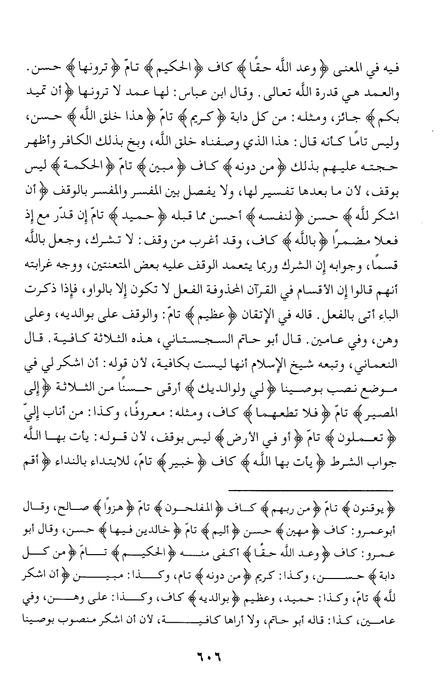 يُوقِنُونَ تامّ مِنْ رَبِّهِمْ كاف الْمُفْلِحُونَ تامّ هُزُواً صالح، وقال أبو عمرو: كاف مُهِينٌ حسن أَلِيمٍ تامّ خالِدِينَ فِيها حسن، وقال أبو عمرو: كاف وَعْدَ اللَّهِ حَقًّا أكفى منه الْحَكِيمُ تامّ مِنْ كُلِّ دابَّةٍ حسن، وكذا: كريم مِنْ دُونِهِ تام، وكذا: مبين أَنِ اشْكُرْ لِلَّهِ تامّ، وكذا: حميد، وعظيم بِوالِدَيْهِ كاف، وكذا: على وهن، وفي عامين، كذا: قاله أبو حاتم، ولا أراها كافية، لأن أن اشكر منصوب بوصينا