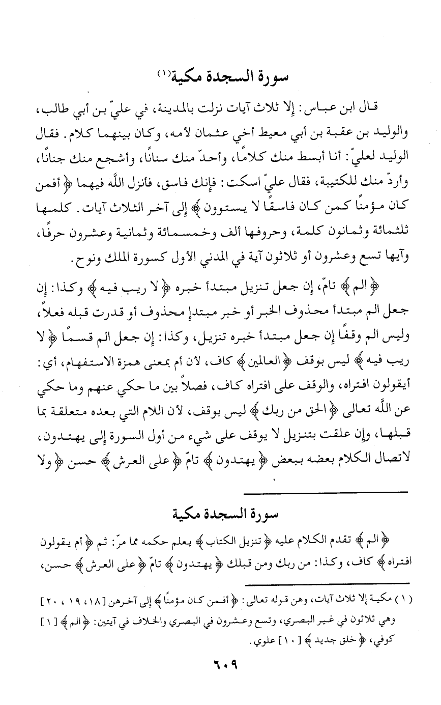 سورة السجدة مكية الم تقدم الكلام عليه تَنْزِيلُ الْكِتابِ يعلم حكمه مما مرّ: ثم أَمْ يَقُولُونَ افْتَراهُ كاف، وكذا: من ربك ومن قبلك يَهْتَدُونَ تامّ عَلَى الْعَرْشِ حسن،