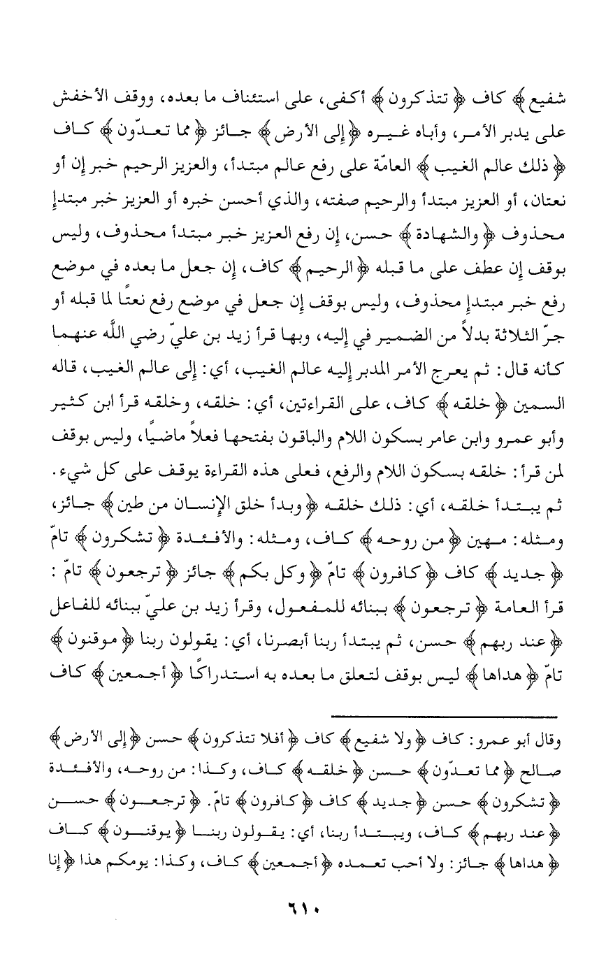 شَفِيعٍ كاف تَتَذَكَّرُونَ أكفى، على استئناف ما بعده، ووقف الأخفش على يدبر الأمر، وأباه غيره إِلَى الْأَرْضِ جائز مِمَّا تَعُدُّونَ كاف ذلِكَ عالِمُ الْغَيْبِ العامّة على رفع عالم مبتدأ، والعزيز الرحيم خبر إن أو نعتان، أو العزيز مبتدأ والرحيم صفته، والذي أحسن خبره أو العزيز خبر مبتدإ محذوف وَالشَّهادَةِ حسن، إن رفع العزيز خبر مبتدأ محذوف، وليس بوقف إن عطف على ما قبله الرَّحِيمُ كاف، إن جعل ما بعده في موضع رفع خبر مبتدإ محذوف، وليس بوقف إن جعل في موضع رفع نعتا لما قبله أو جرّ الثلاثة بدلا من الضمير في إليه، وبها قرأ زيد بن عليّ رضي الله عنهما كأنه قال: ثم يعرج الأمر المدبر إليه عالم الغيب، أي: إلى عالم الغيب، قاله السمين خَلَقَهُ كاف، على القراءتين، أي: خلقه، وخلقه قرأ ابن كثير وأبو عمرو وابن عامر بسكون اللام والباقون بفتحها فعلا ماضيا، وليس بوقف لمن قرأ: خلقه بسكون اللام والرفع، فعلى هذه القراءة يوقف على كل شيء.