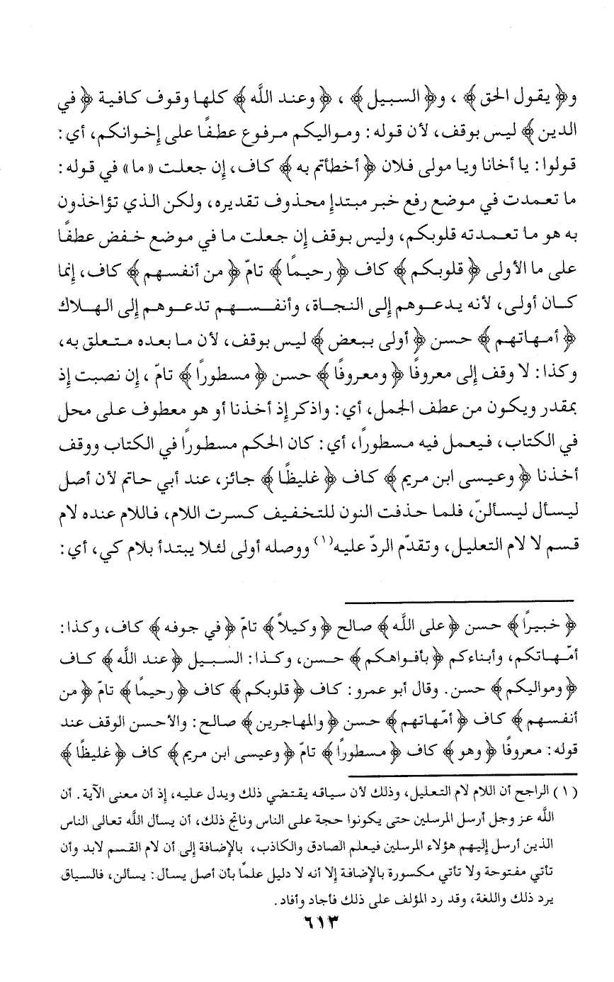 (¬1) الراجح أن اللام لام التعليل، وذلك لأن سياقه يقتضي ذلك ويدل عليه، إذ أن معنى الآية. أن الله عزّ وجلّ أرسل المرسلين حتى يكونوا حجة على الناس وناتج ذلك، أن يسأل الله تعالى الناس الذين أرسل إليهم هؤلاء المرسلين فيعلم الصادق والكاذب، بالإضافة إلى أن لام القسم لا بد وأن تأتي مفتوحة ولا تأتي مكسورة بالإضافة إلى أن لا دليل علما بأن أصل يسأل: يسألن، فالسياق يرد ذلك واللغة، وقد رد المؤلف على ذلك فأجاد وأفاد.