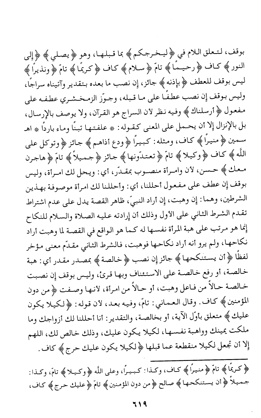 بوقف، لتعلق اللام في لِيُخْرِجَكُمْ بما قبلها، وهو يُصَلِّي إِلَى النُّورِ كاف رَحِيماً تامّ سَلامٌ كاف كَرِيماً تامّ وَنَذِيراً ليس بوقف للعطف بِإِذْنِهِ جائز، إن نصب ما بعده بتقدير وآتيناه سراجا، وليس بوقف إن نصب عطفا على ما قبله، وجوّز الزمخشري عطفه على مفعول أَرْسَلْناكَ وفيه نظر لأن السراج هو القرآن، ولا يوصف بالإرسال، بل بالإنزال إلا أن يحمل على المعنى كقوله: