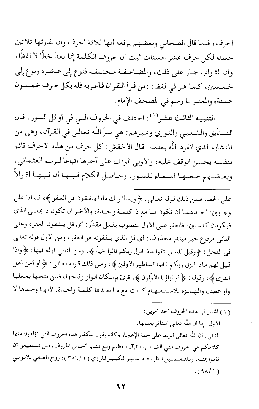 أحرف، فلما قال الصحابي وبعضهم يرفعه أنها ثلاثة أحرف وأن لقارئها ثلاثين حسنة لكل حرف عشر حسنات ثبت أن حروف الكلمة إنما تعدّ خطّا لا لفظا، وأن الثواب جار على ذلك، والمضاعفة مختلفة فنوع إلى عشرة ونوع إلى خمسين، كما هو في لفظ: «من قرأ القرآن فأعربه فله بكل حرف خمسون حسنة» والمعتبر ما رسم في المصحف الإمام.