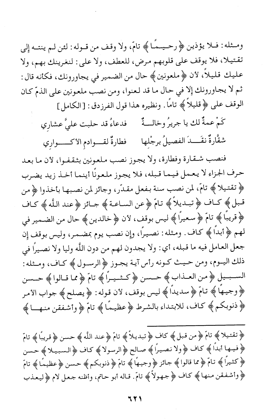فنصب شقارة وفطارة، ولا يجوز نصب ملعونين بثقفوا، لأن ما بعد حرف الجزاء لا يعمل فيما قبله، فلا يجوز ملعونا أينما أخذ زيد يضرب تَقْتِيلًا تامّ، لمن نصب سنة بفعل مقدّر، وجائز لمن نصبها بأخذوا مِنْ قَبْلُ كاف تَبْدِيلًا تامّ عَنِ السَّاعَةِ جائز عِنْدَ اللَّهِ كاف قَرِيباً تامّ سَعِيراً ليس بوقف، لأن خالِدِينَ حال من الضمير في لهم أَبَداً كاف. ومثله: نصيرا، وإن نصب يوم بمضمر، وليس بوقف إن جعل العامل فيه ما قبله، أي: ولا يجدون لهم من دون الله وليا ولا نصيرا في ذلك اليوم، ومن حيث كونه رأس آية يجوز الرَّسُولَا كاف، ومثله:
