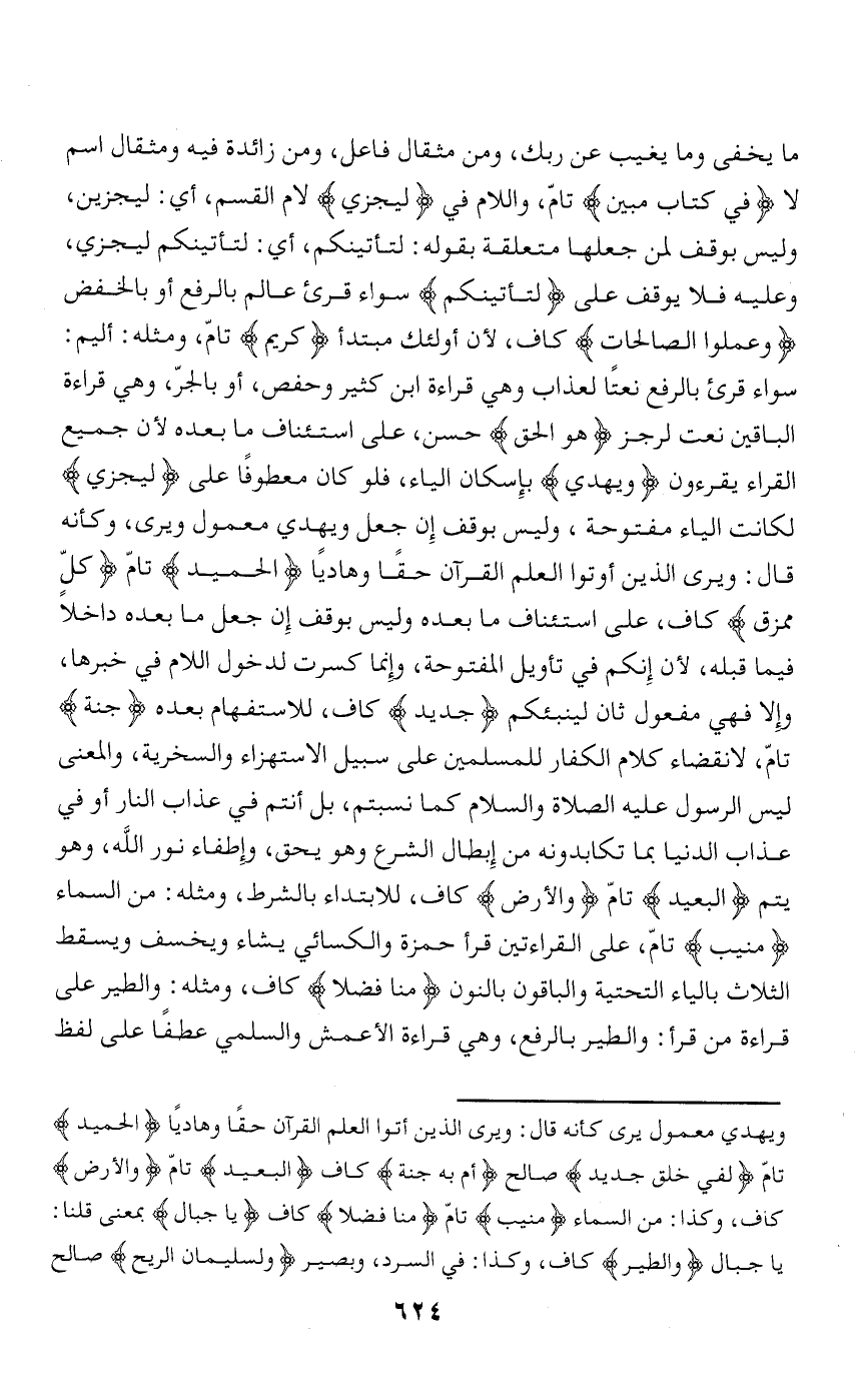 سواء قرئ بالرفع نعتا لعذاب وهي قراءة ابن كثير وحفص، أو بالجرّ، وهي قراءة الباقين نعت لرجز هُوَ الْحَقَّ حسن، على استئناف ما بعده لأن جميع القراء يقرءون وَيَهْدِي بإسكان الياء، فلو كان معطوفا على لِيَجْزِيَ لكانت الياء مفتوحة، وليس بوقف إن جعل ويهدي معمول ويرى، وكأنه قال: ويرى الذين أوتوا العلم القرآن حقا وهاديا الْحَمِيدِ تامّ كُلَّ مُمَزَّقٍ كاف، على استئناف ما بعده وليس بوقف إن جعل ما بعده داخلا فيما قبله، لأن إنكم في تأويل المفتوحة، وإنما كسرت لدخول اللام في خبرها، وإلا فهي مفعول ثان لينبئكم جَدِيدٍ كاف، للاستفهام بعده جِنَّةٌ تامّ، لانقضاء كلام الكفار للمسلمين على سبيل الاستهزاء والسخرية، والمعنى ليس الرسول عليه الصلاة والسلام كما نسبتم، بل أنتم في عذاب النار أو في عذاب الدنيا بما تكابدونه من إبطال الشرع وهو يحق، وإطفاء نور الله، وهو يتم الْبَعِيدِ تامّ وَالْأَرْضِ كاف، للابتداء بالشرط، ومثله: من السماء مُنِيبٍ تامّ، على القراءتين قرأ حمزة والكسائي يشاء ويخسف ويسقط الثلاث بالياء التحتية والباقون بالنون مِنَّا فَضْلًا كاف، ومثله: والطير على قراءة من قرأ: والطير بالرفع، وهي قراءة الأعمش والسلمي عطفا على لفظ
