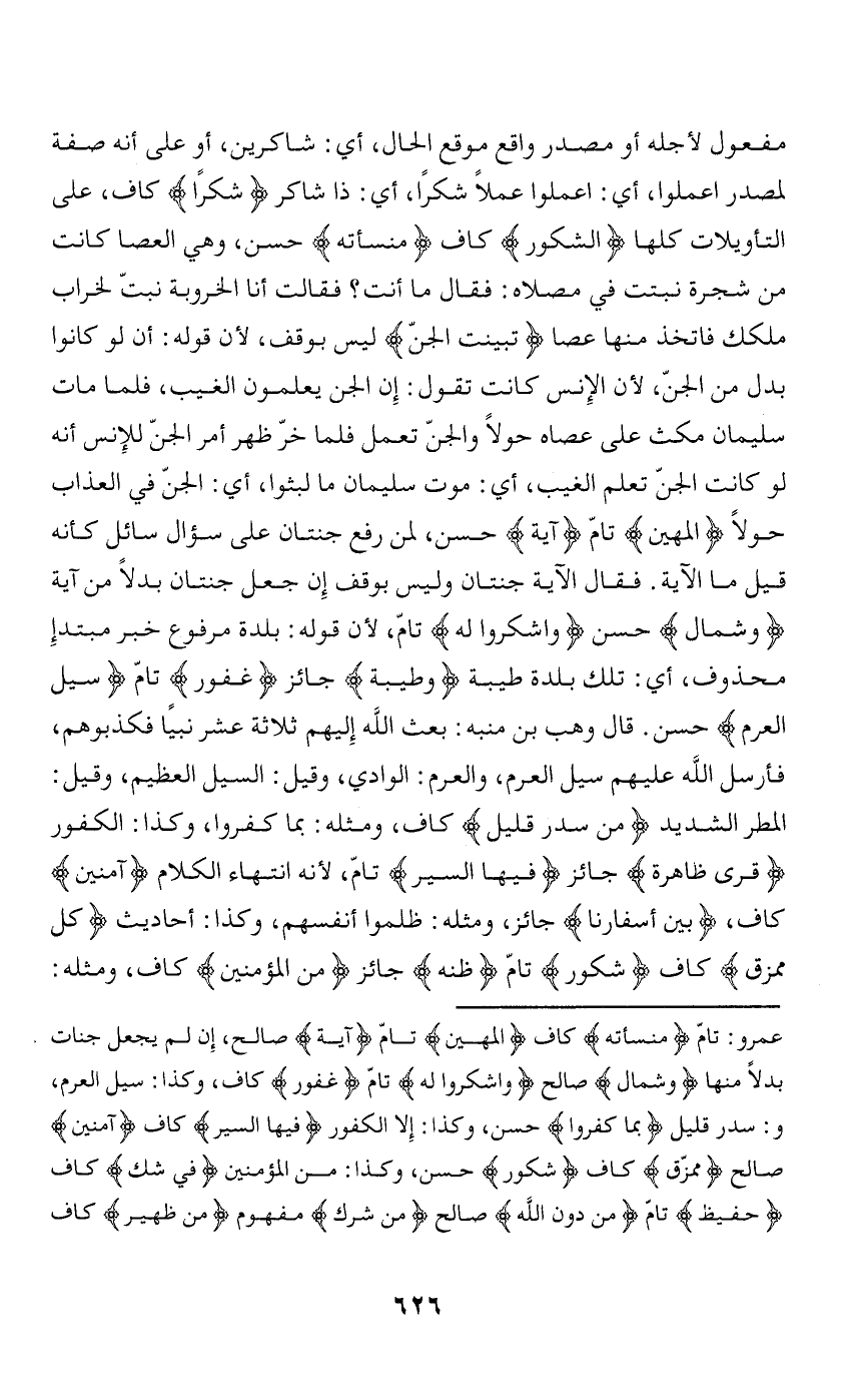 مفعول لأجله أو مصدر واقع موقع الحال، أي: شاكرين، أو على أنه صفة لمصدر اعملوا، أي: اعملوا عملا شكرا، أي: ذا شاكر شُكْراً كاف، على التأويلات كلها الشَّكُورُ كاف مِنْسَأَتَهُ حسن، وهي العصا كانت من شجرة نبتت في مصلاه: فقال ما أنت؟ فقالت أنا الخروبة نبتّ لخراب ملكك فاتخذ منها عصا تَبَيَّنَتِ الْجِنُّ ليس بوقف، لأن قوله: أن لو كانوا بدل من الجنّ، لأن الإنس كانت تقول: إن الجن يعلمون الغيب، فلما مات سليمان مكث على عصاه حولا والجنّ تعمل فلما خرّ ظهر أمر الجنّ للإنس أنه لو كانت الجنّ تعلم الغيب، أي: موت سليمان ما لبثوا، أي: الجنّ في العذاب حولا الْمُهِينِ تامّ آيَةٌ حسن، لمن رفع جنتان على سؤال سائل كأنه قيل ما الآية. فقال الآية جنتان وليس بوقف إن جعل جنتان بدلا من آية وَشِمالٍ حسن وَاشْكُرُوا لَهُ تامّ، لأن قوله: بلدة مرفوع خبر مبتدإ محذوف، أي: تلك بلدة طيبة وطَيِّبَةٌ جائز غَفُورٌ تامّ سَيْلَ الْعَرِمِ حسن. قال وهب بن منبه: بعث الله إليهم ثلاثة عشر نبيا فكذبوهم، فأرسل الله عليهم سيل العرم، والعرم: الوادي، وقيل: السيل العظيم، وقيل: