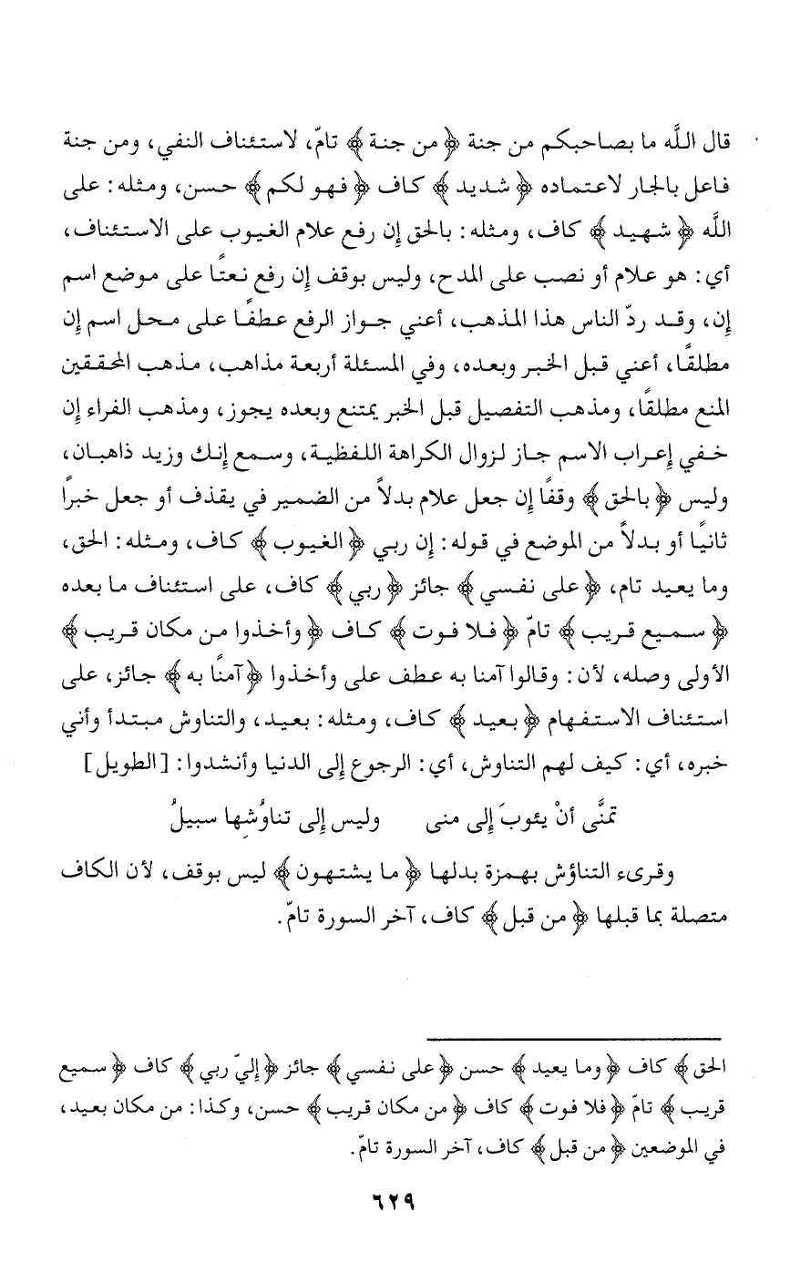 قال الله ما بصاحبكم من جنة مِنْ جِنَّةٍ تامّ، لاستئناف النفي، ومن جنة فاعل بالجار لاعتماده شَدِيدٍ كاف فَهُوَ لَكُمْ حسن، ومثله: على الله شَهِيدٌ كاف، ومثله: بالحق إن رفع علام الغيوب على الاستئناف، أي: هو علام أو نصب على المدح، وليس بوقف إن رفع نعتا على موضع اسم إن، وقد ردّ الناس هذا المذهب، أعني جواز الرفع عطفا على محل اسم إن مطلقا، أعني قبل الخبر وبعده، وفي المسألة أربعة مذاهب، مذهب المحققين المنع مطلقا، ومذهب التفصيل قبل الخبر يمتنع وبعده يجوز، ومذهب الفراء إن خفي إعراب الاسم جاز لزوال الكراهة اللفظية، وسمع إنك وزيد ذاهبان، وليس بِالْحَقِّ وقفا إن جعل علام بدلا من الضمير في يقذف أو جعل خبرا ثانيا أو بدلا من الموضع في قوله: إن ربي الْغُيُوبِ كاف، ومثله: الحق، وما يعيد تام، عَلى نَفْسِي جائز رَبِّي كاف، على استئناف ما بعده سَمِيعٌ قَرِيبٌ تامّ فَلا فَوْتَ كاف وَأُخِذُوا مِنْ مَكانٍ قَرِيبٍ الأولى وصله، لأن: وقالوا آمنا به عطف على وأخذوا آمَنَّا بِهِ جائز، على استئناف الاستفهام بَعِيدٍ كاف، ومثله: بعيد، والتناوش مبتدأ وأني خبره، أي: كيف لهم التناوش، أي: الرجوع إلى الدنيا وأنشدوا: [الطويل]