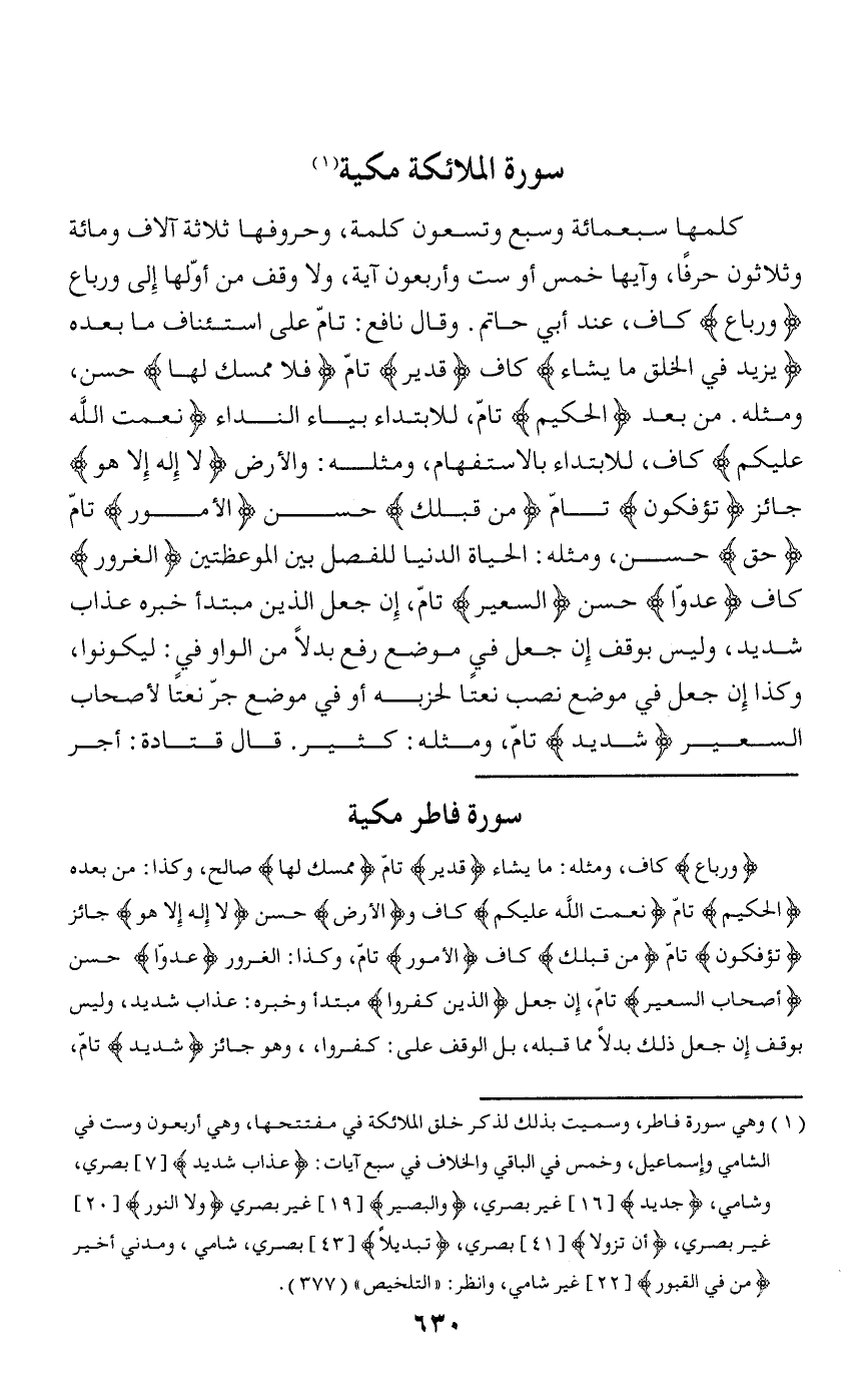 سورة فاطر مكية وَرُباعَ كاف، ومثله: ما يشاء قَدِيرٌ تامّ مُمْسِكَ لَها صالح، وكذا: من بعده الْحَكِيمُ تامّ نِعْمَتَ اللَّهِ عَلَيْكُمْ كاف والْأَرْضِ حسن لا إِلهَ إِلَّا هُوَ جائز تُؤْفَكُونَ تامّ مِنْ قَبْلِكَ كاف الْأُمُورُ تامّ، وكذا: الغرور عَدُوًّا حسن أَصْحابِ السَّعِيرِ تامّ، إن جعل الَّذِينَ كَفَرُوا مبتدأ وخبره: عذاب شديد، وليس بوقف إن جعل ذلك بدلا مما قبله، بل الوقف على: كفروا، وهو جائز شَدِيدٌ تامّ،