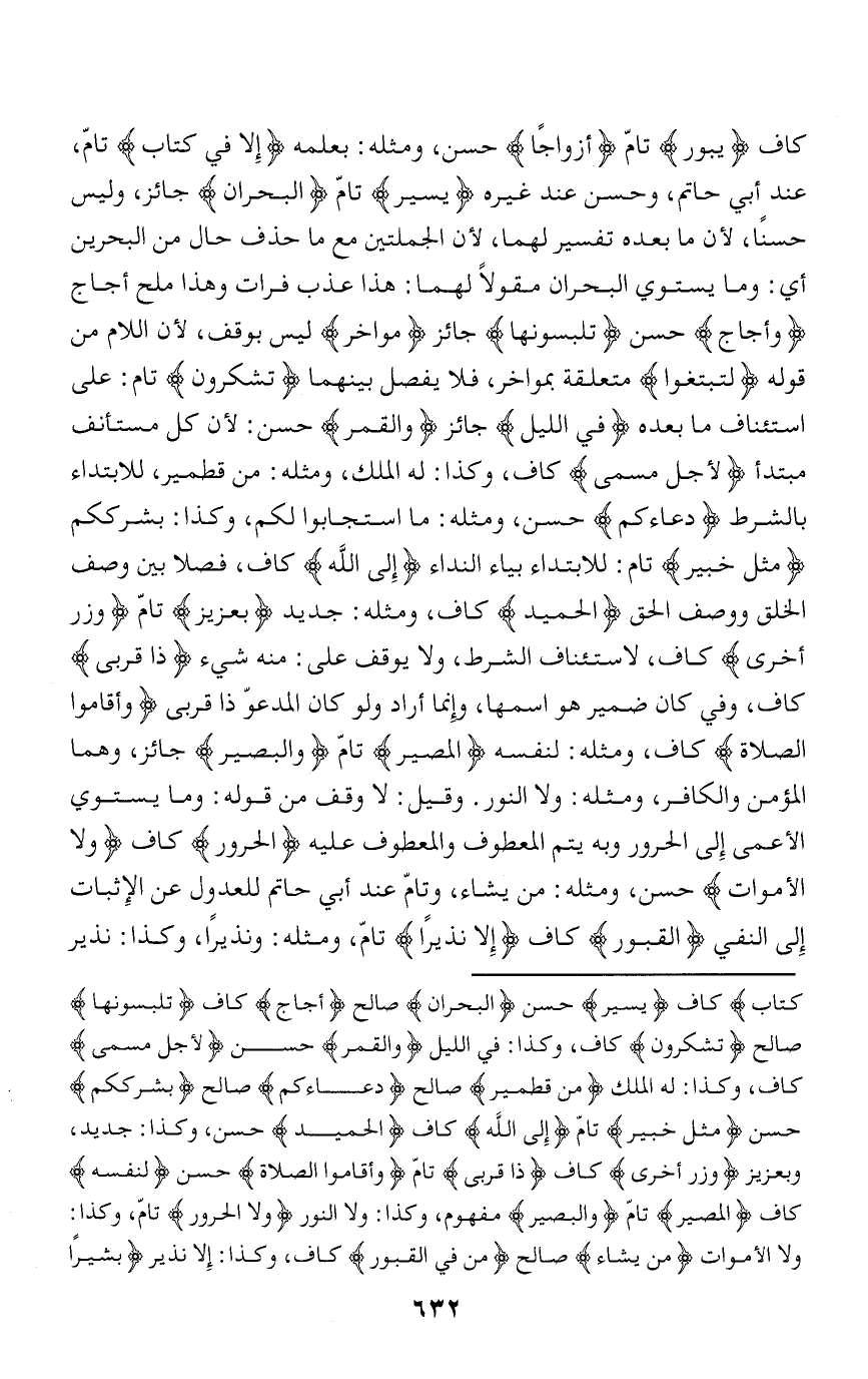 كاف يَبُورُ تامّ أَزْواجاً حسن، ومثله: بعلمه إِلَّا فِي كِتابٍ تامّ، عند أبي حاتم، وحسن عند غيره يَسِيرٌ تامّ الْبَحْرانِ جائز، وليس حسنا، لأن ما بعده تفسير لهما، لأن الجملتين مع ما حذف حال من البحرين أي: وما يستوي البحران مقولا لهما: هذا عَذْبٌ فُراتٌ وَهذا مِلْحٌ أُجاجٌ وأُجاجٌ حسن تَلْبَسُونَها جائز مَواخِرَ ليس بوقف، لأن اللام من قوله لِتَبْتَغُوا متعلقة بمواخر، فلا يفصل بينهما تَشْكُرُونَ تام: على استئناف ما بعده فِي اللَّيْلِ جائز وَالْقَمَرَ حسن: لأن كل مستأنف مبتدأ لِأَجَلٍ مُسَمًّى كاف، وكذا: له الملك، ومثله: من قطمير، للابتداء بالشرط دُعاءَكُمْ حسن، ومثله: ما استجابوا لكم، وكذا: بشرككم مِثْلُ خَبِيرٍ تام: للابتداء بياء النداء إِلَى اللَّهِ كاف، فصلا بين وصف الخلق ووصف الحق الْحَمِيدُ كاف، ومثله: جديد بِعَزِيزٍ تامّ وِزْرَ أُخْرى كاف، لاستئناف الشرط، ولا يوقف على: منه شيء ذا قُرْبى كاف، وفي كان ضمير هو اسمها، وإنما أراد ولو كان المدعوّ ذا قربى وَأَقامُوا الصَّلاةَ كاف، ومثله: لنفسه الْمَصِيرُ تامّ وَالْبَصِيرُ جائز، وهما المؤمن والكافر، ومثله: ولا النور. وقيل: لا وقف من قوله: وما يستوي الأعمى إلى الحرور وبه يتم المعطوف والمعطوف عليه الْحَرُورُ كاف وَلَا الْأَمْواتُ حسن، ومثله: من يشاء، وتامّ عند أبي حاتم للعدول عن الإثبات إلى النفي الْقُبُورِ كاف إِلَّا نَذِيرٌ تامّ، ومثله: ونذيرا، وكذا: نذير