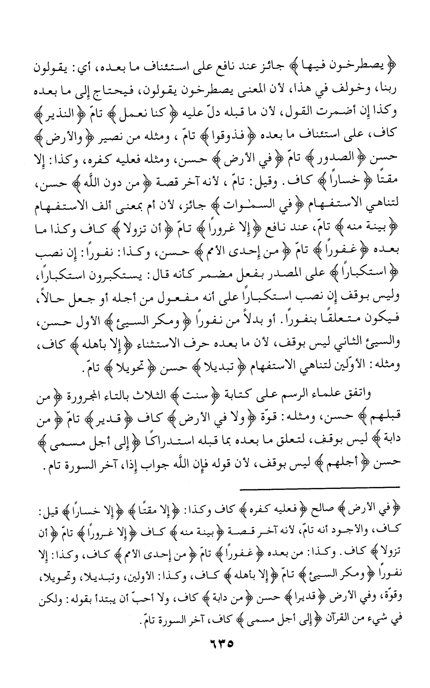 يَصْطَرِخُونَ فِيها جائز عند نافع على استئناف ما بعده، أي: يقولون ربنا، وخولف في هذا، لأن المعنى يصطرخون يقولون، فيحتاج إلى ما بعده وكذا إن أضمرت القول، لأن ما قبله دلّ عليه كُنَّا نَعْمَلُ تامّ النَّذِيرُ كاف، على استئناف ما بعده فَذُوقُوا تامّ، ومثله من نصير وَالْأَرْضِ حسن الصُّدُورِ تامّ فِي الْأَرْضِ حسن، ومثله فعليه كفره، وكذا: إلا مقتا خَساراً كاف. وقيل: تامّ، لأنه آخر قصة مِنْ دُونِ اللَّهِ حسن، لتناهي الاستفهام فِي السَّماواتِ جائز، لأن أم بمعنى ألف الاستفهام بَيِّنَةٍ مِنْهُ تامّ، عند نافع إِلَّا غُرُوراً تامّ أَنْ تَزُولا كاف وكذا ما بعده غَفُوراً تامّ مِنْ إِحْدَى الْأُمَمِ حسن، وكذا: نفورا: إن نصب اسْتِكْباراً على المصدر بفعل مضمر كأنه قال: يستكبرون استكبارا، وليس بوقف إن نصب استكبارا على أنه مفعول من أجله أو جعل حالا، فيكون متعلقا بنفورا. أو بدلا من نفورا وَمَكْرَ السَّيِّئِ الأول حسن، والسيئ الثاني ليس بوقف، لأن ما بعده حرف الاستثناء إِلَّا بِأَهْلِهِ كاف، ومثله: الأوّلين لتناهي الاستفهام تَبْدِيلًا حسن تَحْوِيلًا تامّ.