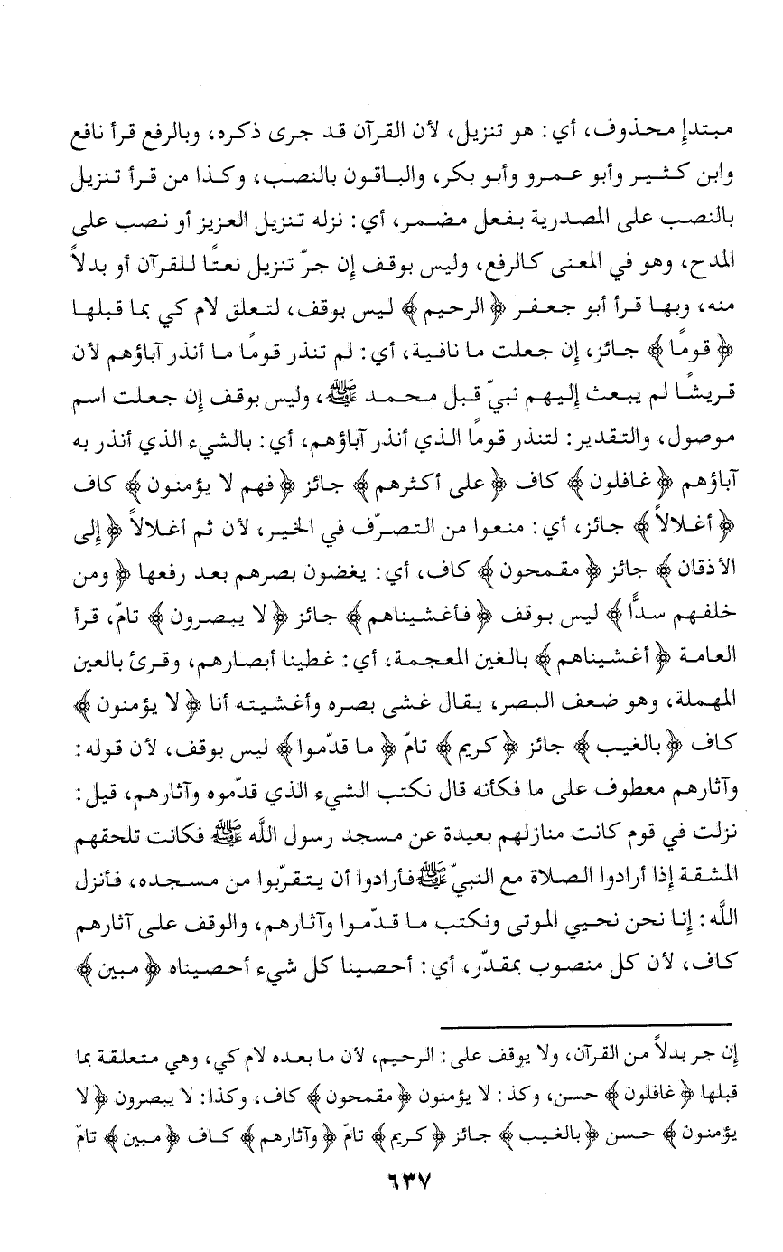 إن جر بدلا من القرآن، ولا يوقف على: الرحيم، لأن ما بعده لام كي، وهي متعلقة بما قبلها غافِلُونَ حسن، وكذا: لا يؤمنون مُقْمَحُونَ كاف، وكذا: لا يبصرون لا يُؤْمِنُونَ حسن بِالْغَيْبِ جائز كَرِيمٍ تامّ وَآثارَهُمْ كاف مُبِينٍ تامّ