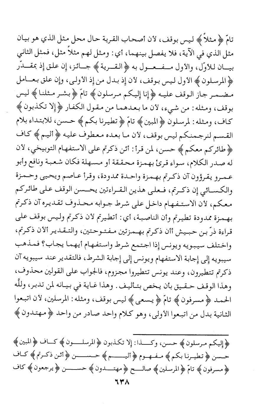 تامّ مَثَلًا ليس بوقف، لأن أصحاب القرية حال محل مثل الذي هو بيان مثل الذي في الآية، فلا يفصل بينهما، أي: ومثل لهم مثلا مثل، فمثل الثاني بيان للأوّل، والأول مفعول به الْقَرْيَةِ جائز، إن علق إذ بمقدّر الْمُرْسَلُونَ الأول ليس بوقف، لأن إذ بدل من إذ الأولى، وإن علق بعامل مضمر جاز الوقف عليه إِنَّا إِلَيْكُمْ مُرْسَلُونَ تامّ بَشَرٌ مِثْلُنا ليس بوقف، ومثله: من شيء، لأن ما بعدهما من مقول الكفار إِلَّا تَكْذِبُونَ كاف، ومثله: لمرسلون الْمُبِينُ تامّ تَطَيَّرْنا بِكُمْ حسن، للابتداء بلام القسم لنرجمنكم ليس بوقف، لأن ما بعده معطوف عليه أَلِيمٌ كاف طائِرُكُمْ مَعَكُمْ حسن، لمن قرأ: أئن ذكرتم على الاستفهام التوبيخي، لأن له صدر الكلام، سواء قرئ بهمزة محققة أو مسهلة فكان شعبة ونافع وأبو عمرو يقرءون آن ذكرتم بهمزة واحدة ممدودة، وقرأ عاصم ويحيى وحمزة والكسائي إن ذكرتم فعلى هذين القراءتين يحسن الوقف على طائركم معكم، لأن الاستفهام داخل على شرط جوابه محذوف تقديره آن ذكرتم بهمزة ممدودة تطيرتم وأن الناصبة، أي: أتطيرتم لأن ذكرتم وليس بوقف على قراءة ذرّ بن حبيش أأن ذكرتم بهمزتين مفتوحتين، والتقدير ألأن ذكرتم، واختلف سيبويه ويونس إذا اجتمع شرط واستفهام أيهما يجاب؟ فمذهب سيبويه ويونس إذا اجتمع شرط واستفهام أيهما يجاب؟ فمذهب سيبويه إلى إجابة الاستفهام ويونس إلى إجابة الشرط، فالتقدير عند سيبويه آن ذكرتم تتطيرون، وعند يونس تتطيروا مجزوم، فالجواب على القولين محذوف، وهذا الوقف حقيق بأن يخص بتأليف. وهذا غاية في بيانه لمن تدبر، ولله الحمد مُسْرِفُونَ تامّ يَسْعى ليس بوقف، ومثله: المرسلين، لأن اتبعوا الثانية بدل من اتبعوا الأولى، وهو كلام واحد صادر من واحد مُهْتَدُونَ