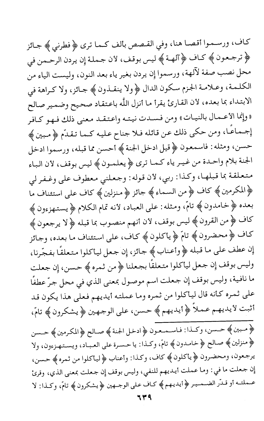كاف، ورسموا أقصا هنا، وفي القصص بألف كما ترى فَطَرَنِي جائز تُرْجَعُونَ كاف آلِهَةً ليس بوقف، لأن جملة إن يردن الرحمن في محل نصب صفة لآلهة، ورسموا إن يردن بغير ياء بعد النون، وليست الياء من الكلمة، وعلامة الجزم سكون الدال وَلا يُنْقِذُونِ جائز، ولا كراهة في الابتداء بما بعده، لأن القارئ يقرأ ما أنزل الله باعتقاد صحيح وضمير صالح «وإنما الأعمال بالنيات» ومن فسدت نيته واعتقد معنى ذلك فهو كافر إجماعا، ومن حكى ذلك عن قائله فلا جناح عليه كما تقدّم مُبِينٍ حسن، ومثله: فاسمعون قِيلَ ادْخُلِ الْجَنَّةَ أحسن مما قبله، ورسموا ادخل الجنة بلام واحدة من غير ياء كما ترى يَعْلَمُونَ ليس بوقف، لأن الباء متعلقة بما قبلها، وكذا: ربي، لأن قوله: وجعلني معطوف على وغفر لي الْمُكْرَمِينَ كاف مِنَ السَّماءِ جائز مُنْزِلِينَ كاف على استئناف ما بعده خامِدُونَ تامّ، ومثله: على العباد، لأنه تمام الكلام يَسْتَهْزِؤُنَ كاف مِنَ الْقُرُونِ ليس بوقف، لأن أنهم منصوب بما قبله لا يَرْجِعُونَ كاف مُحْضَرُونَ تامّ يَأْكُلُونَ كاف، على استئناف ما بعده، وجائز إن عطف على ما قبله وَأَعْنابٍ جائز، إن جعل ليأكلوا متعلقا بفجّرنا، وليس بوقف إن جعل ليأكلوا متعلقا بجعلنا مِنْ ثَمَرِهِ حسن، إن جعلت ما نافية، وليس بوقف إن جعلت اسم موصول بمعنى الذي في محل جرّ عطفا